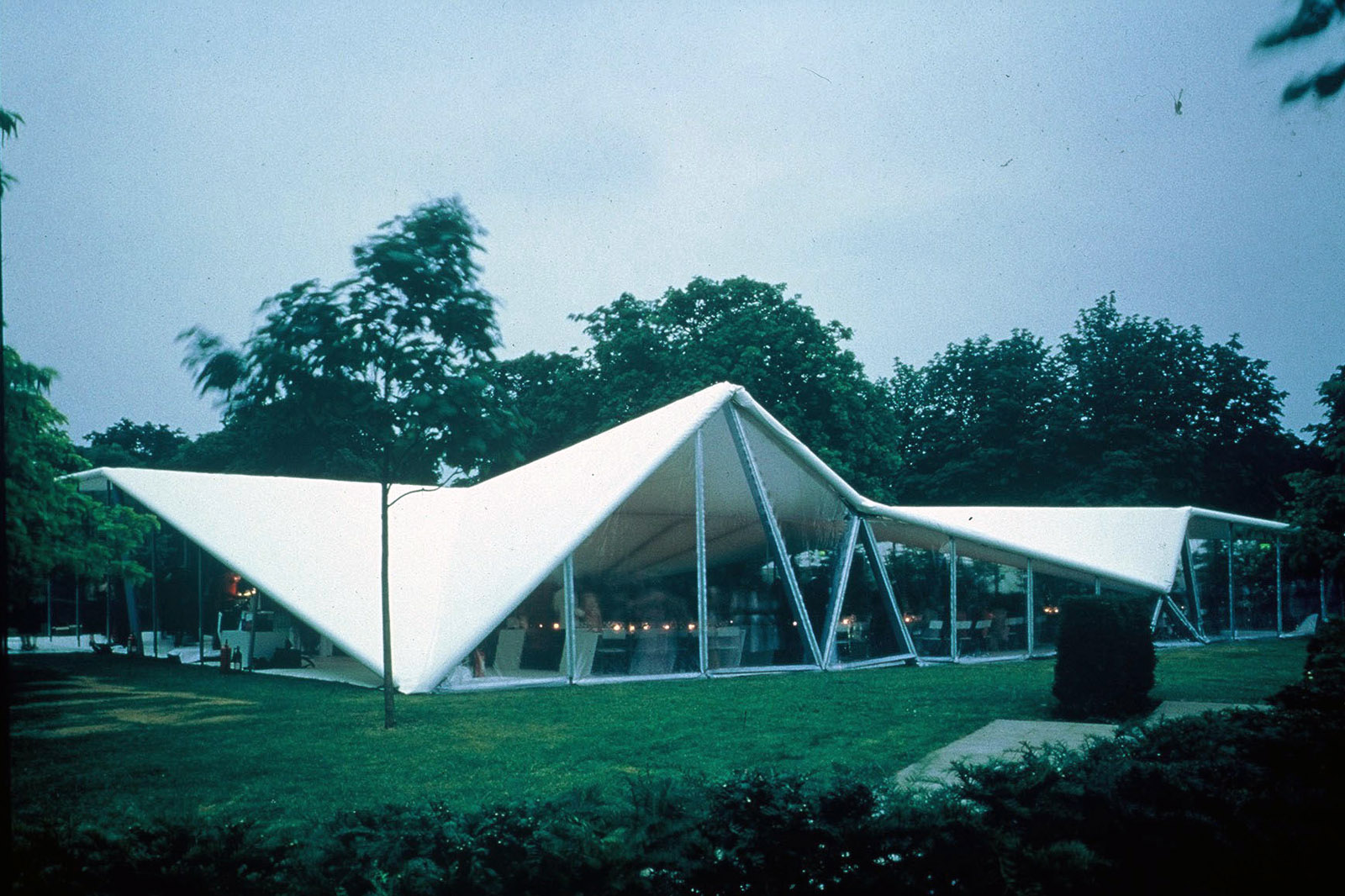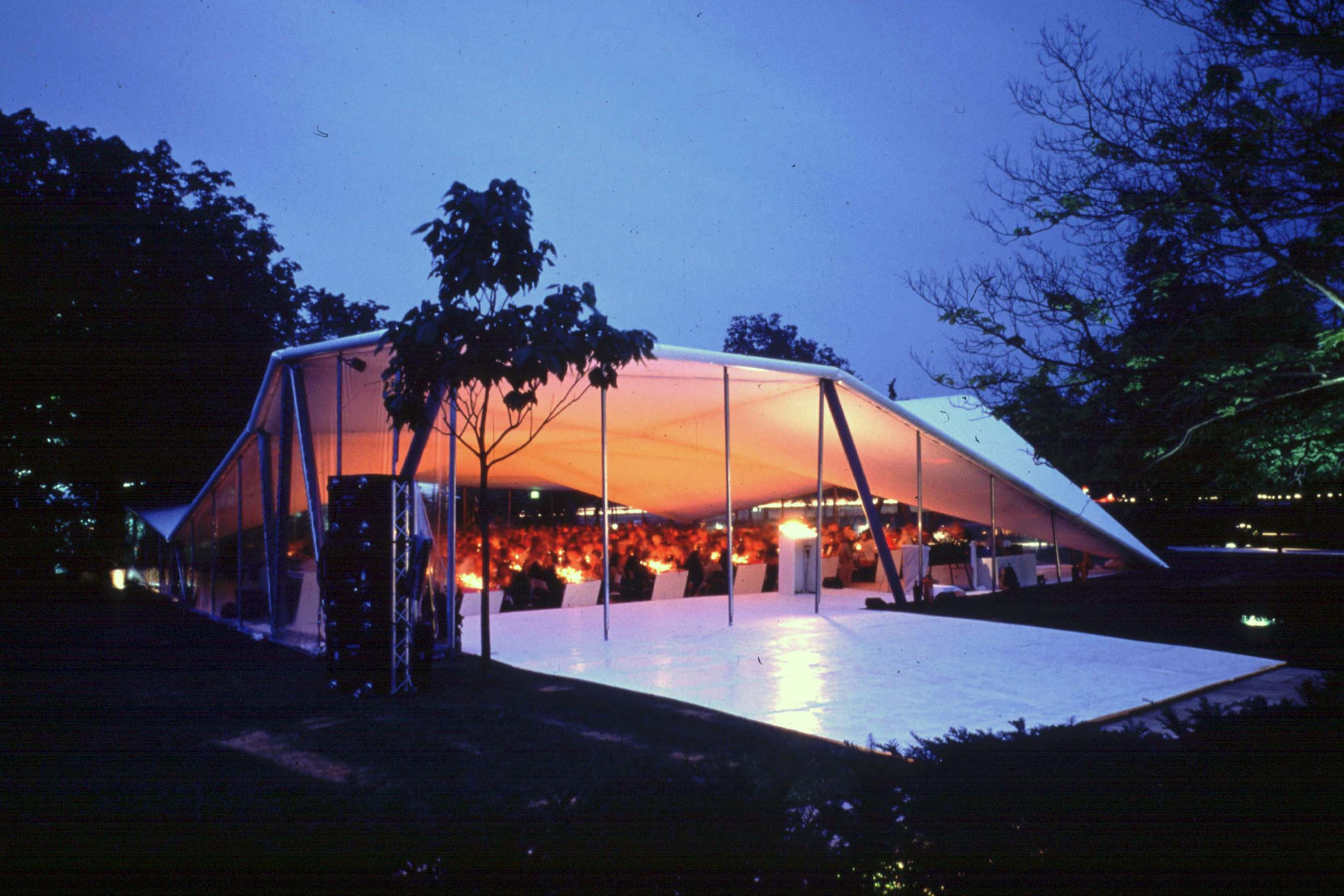 Zaha Hadid's structure radically reinvented the accepted idea of a tent or a marquee. It took the form of a triangulated roof structure spanning an impressive internal space of 600sq metres by using a steel primary structure. A folding form of angular flat planes extending to the ground gave an illusion of solidity while at the same time creating a variety of internal spaces.