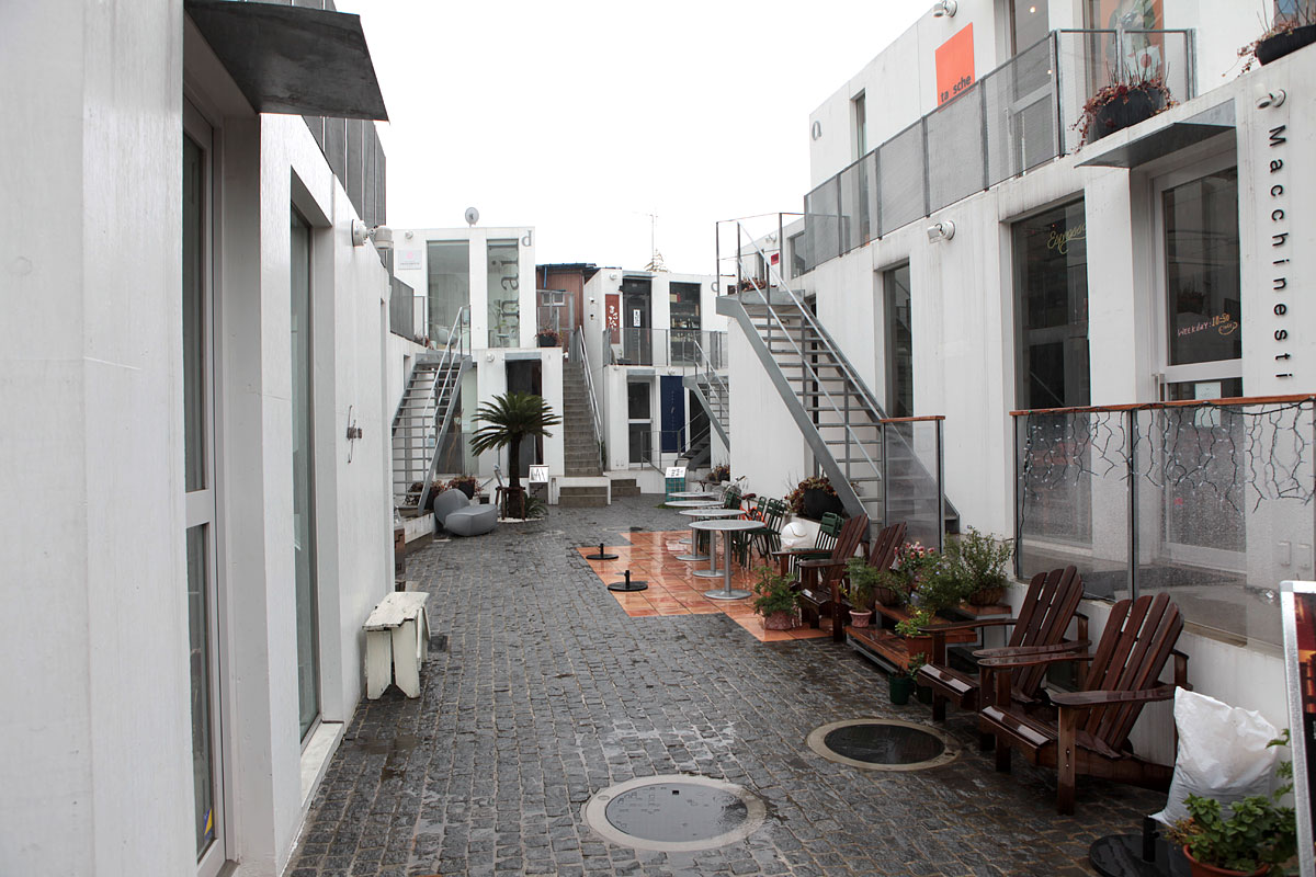 Thereby valley-shaped space between mountains is formed, where people and displayed things will overflow. Each shop can enlarge itself on the mountain-shaped volumes.