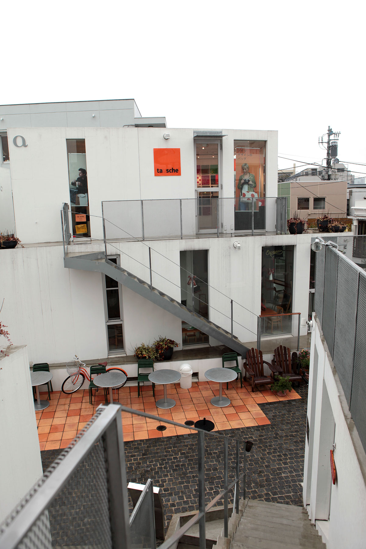 開窗位置與窗戶數量也都影響到整體外觀至店內呈設商品方式的可能性。若不降低隔間牆的存在感、此商場將會成為一個封閉、且各自為一個商店彼此無特殊關係之商場環境。所有視線距離將會極短及貧乏。在將這些重點考慮統整之後、建築師提出對角線穿透視線設計之概念。消費者或店員皆可在各商店內透過各開窗口、可穿透看見各層商店內的人、事、物。讓各商店互相之間有著無形的呼應與對立、如同既是敵手也是盟友之間的共生關係。