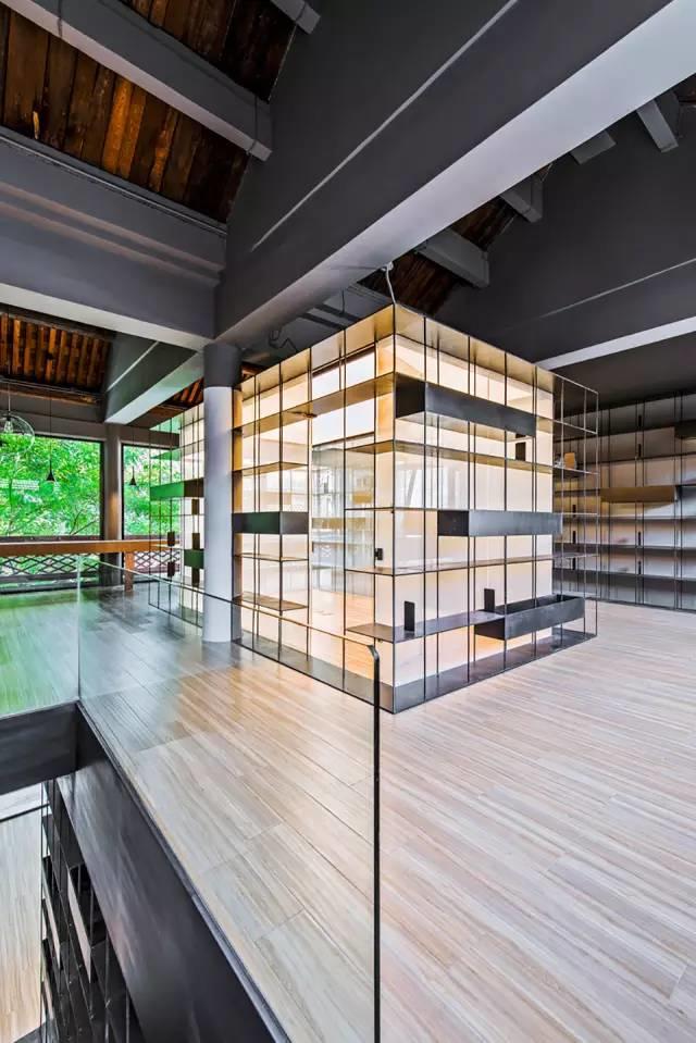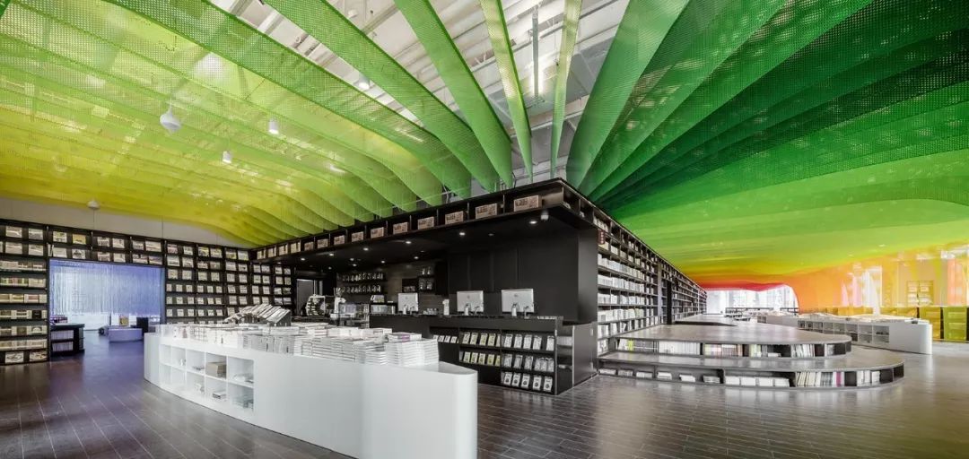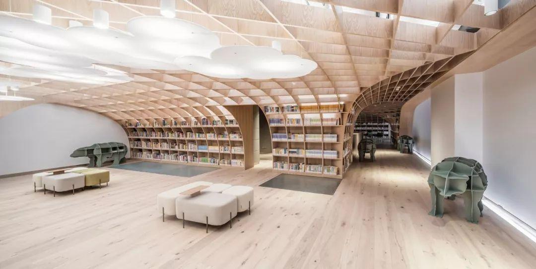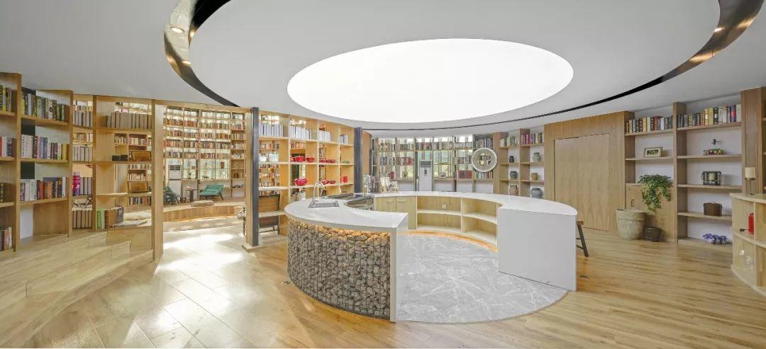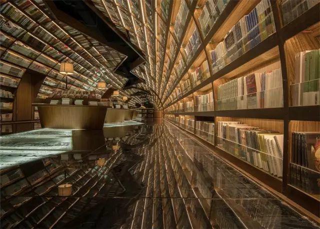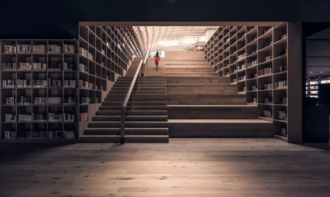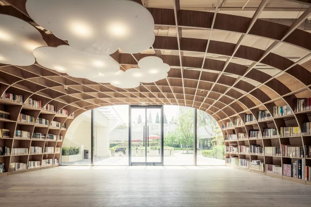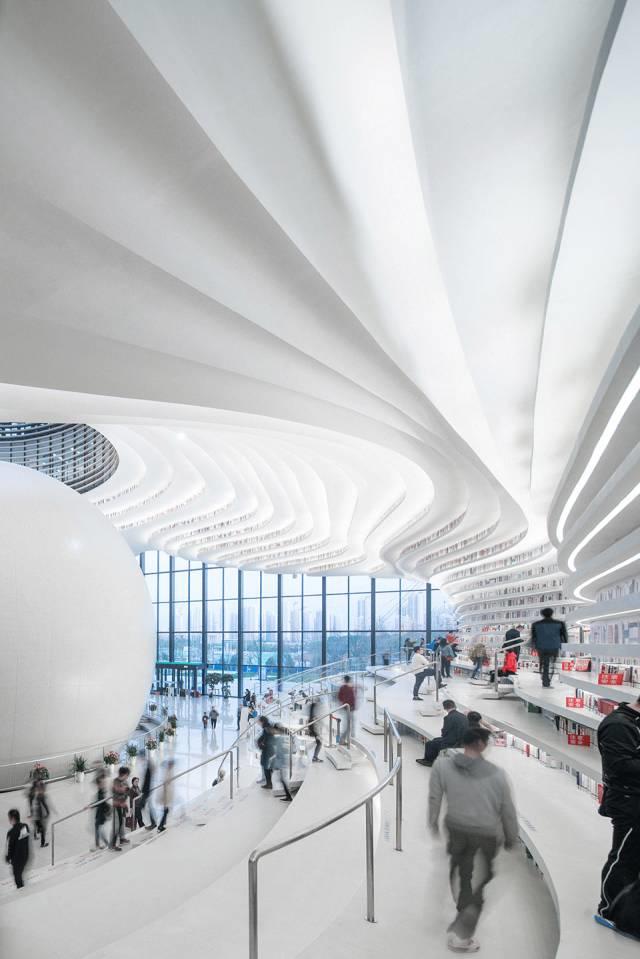 在壯觀的揚州鐘書閣內,設計師利用橋樑的概念,擴展了書籍世界的視覺標誌。讓人聯想到甄苑附近的河流,鏡面的地板和天花板流入了空間的深處,引領讀者深入到浩瀚的知識海洋中。雙方的書架都以優美的弧線延伸了天際線的形狀,就像溪流之間的橋樑,作為讀者和書籍之間的聯繫。