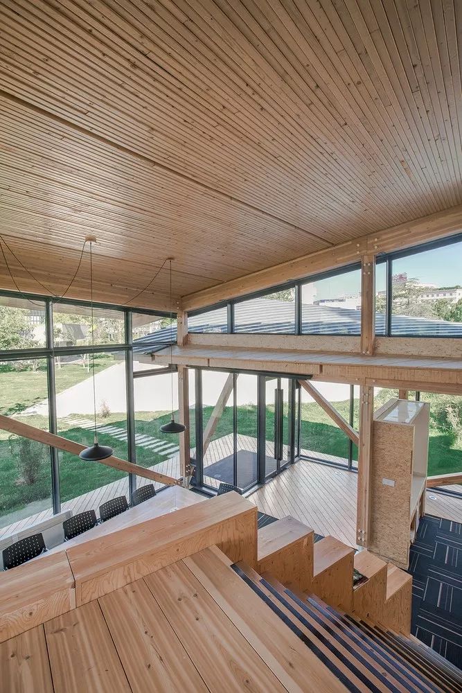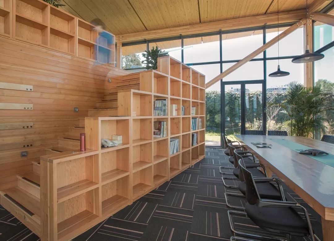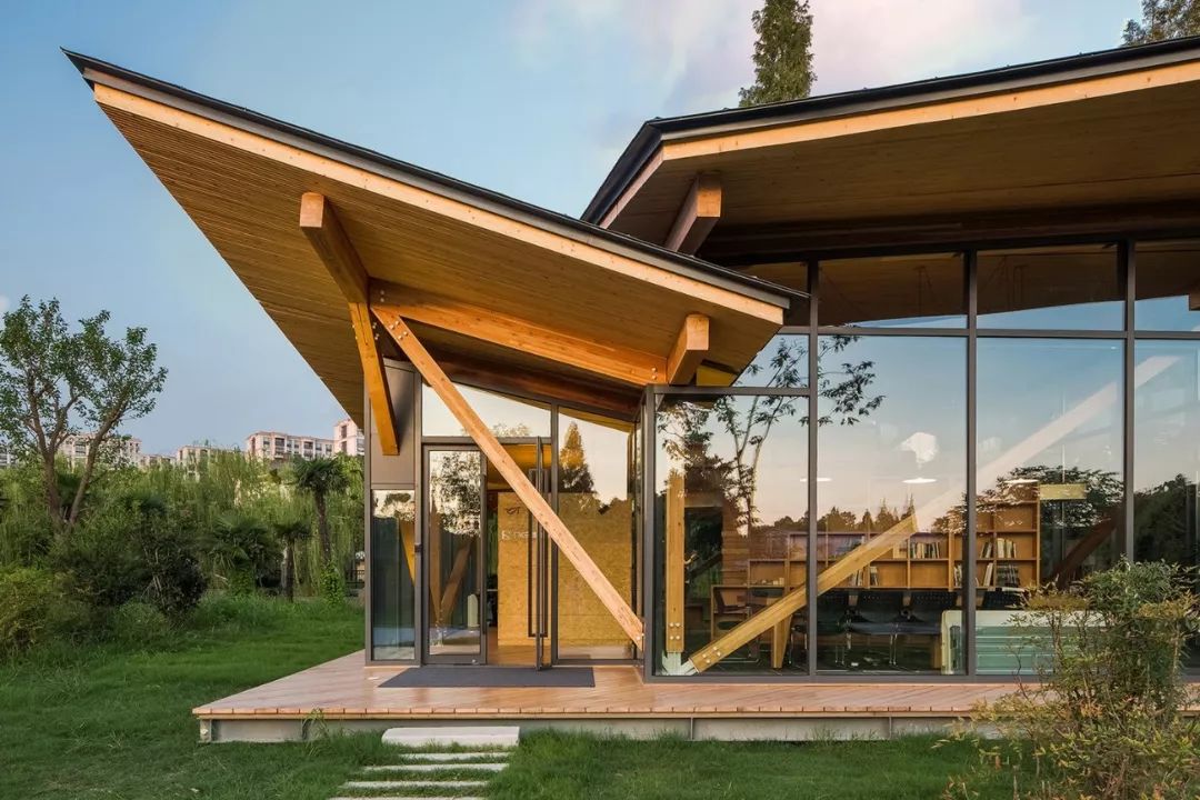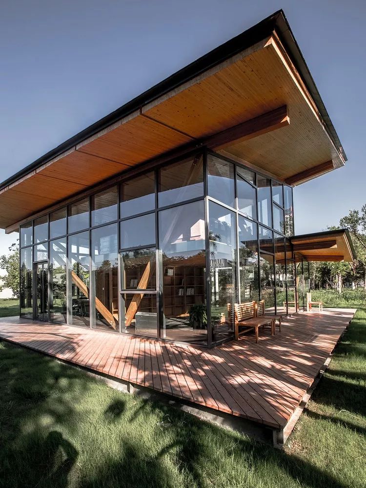 木瀆書屋是在未來會發展成為城市公共綠地的園區內的一座工業化樣板房,得名於近旁流入蘇州河的「木瀆港」河,建造一個木質的「讀書屋」似乎順理成章。淺色的木結構與木裝修分別圍合構成了三個不同的活動區域,可視為親切而活潑的「斜向系統」;而深色的帷幕牆骨架和地毯則構成了作為背襯的穩定的「正向系統」,重疊的二元關係給這個10Mx10M的方形平面空間帶來無拘無束的生動。