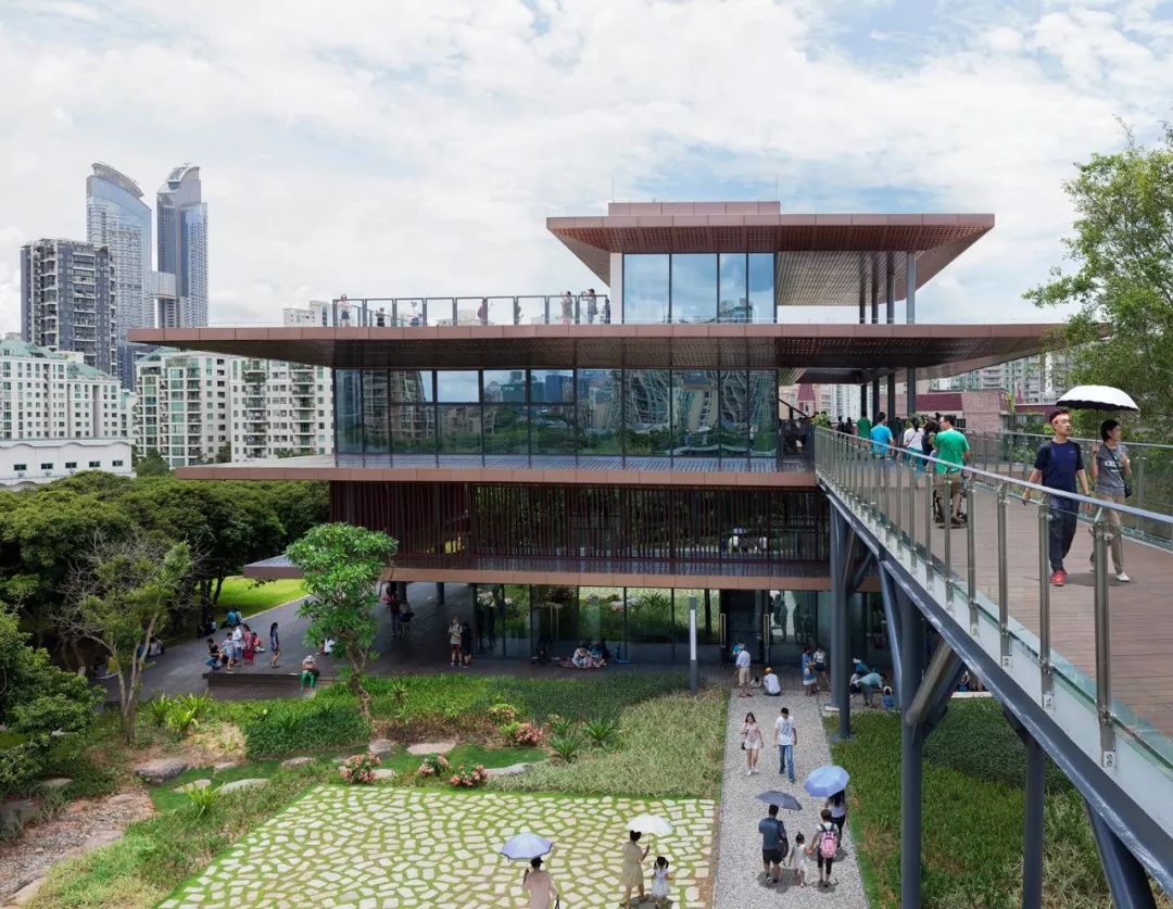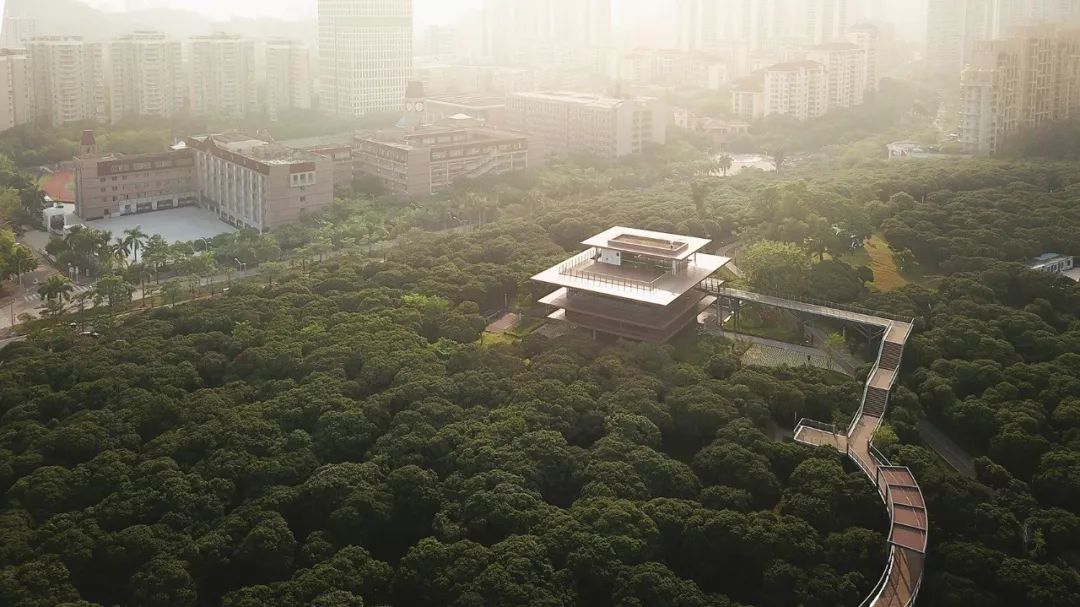 香蜜科學圖書館是一座輕盈的建築,它與公園中的「樹頂步道」形成連接。鋼結構和全玻璃立面構成了建築明亮而通透的基礎。巨大的懸臂式結構覆蓋以金屬塗層,被用於遮擋陽光,其形態參考了當地建築。公共空間從地面抬升,形成一個全景露台,強調出對於自然環境的體驗。