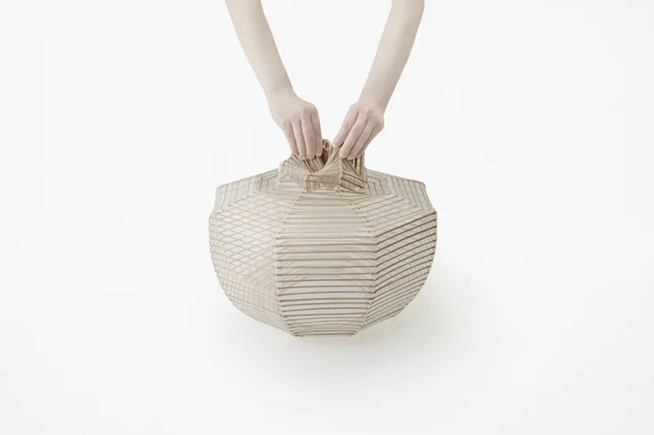 nendo為京都傳統純手工燈籠「小嶋商店」操刀設計的「表裏」燈籠,將內部竹條加上關節,保留可活動的空間,自然就能展現出具彈性且多變的樣態。