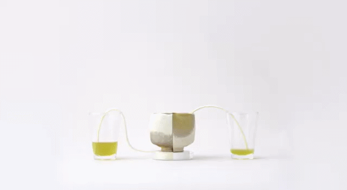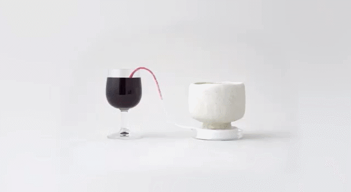 作品名為「潤碗」,Nendo將燒製好的茶碗放置在帶有毛氈的培養皿底座上。再將紅酒、咖啡、紅茶、綠茶、藍莓汁等含有色素的飲料,藉由特殊裝置吸入茶碗之中,讓容器自行繪製色彩圖案。