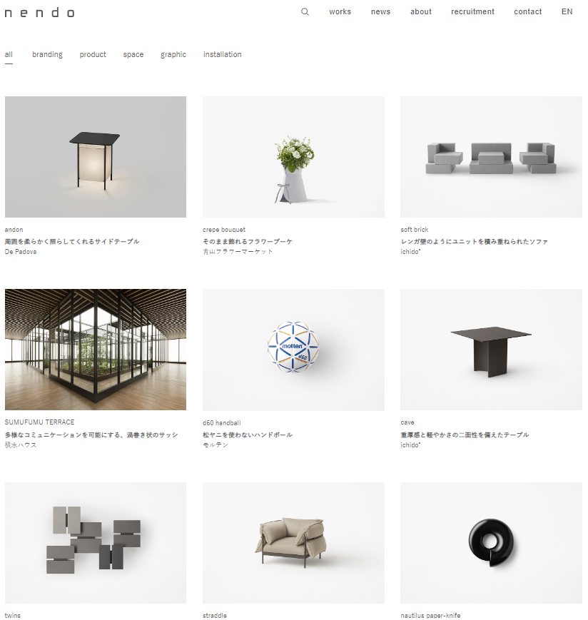 創立初期,Nendo以建築領域為主,而後設計領域開始跨足到室內設計、傢俱設計、產品設計、視覺包裝等不同領域,合作的品牌廣泛:可口可樂、愛馬仕、日清、三宅一生、植村秀、東芝、哈根達斯……