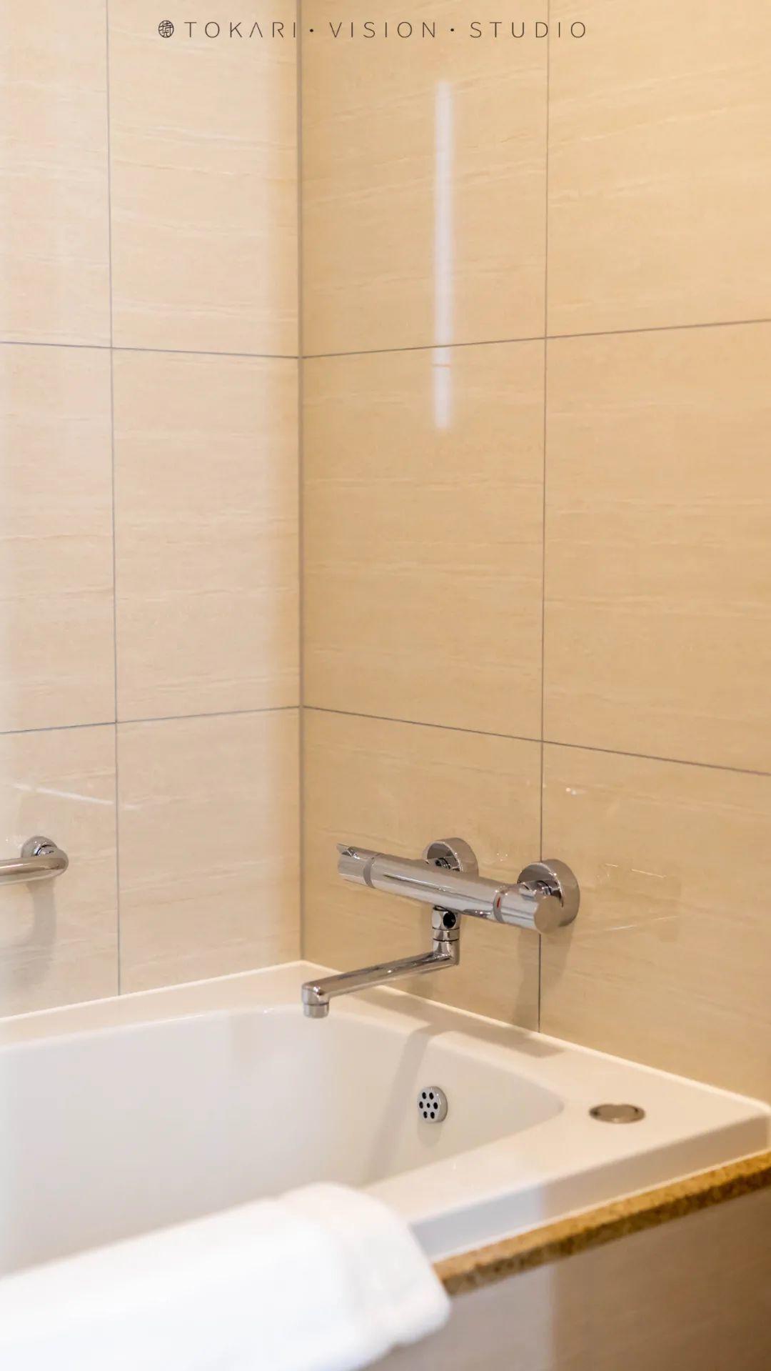不過略微有一點點小失望的是,房間的面積雖然要比日本很多酒店要大一些,可是裝修風格卻有些不統一:臥室是我愛的風格,尤其是床背後的裝飾背景,簡潔、與床品的風格搭配很融合,臨窗的沙發也很舒服;但是衛生間不曉得為何,卻顯得過於簡潔……簡潔的像商務酒店;而對於走廊部分和電視背景牆部分,突然恍惚了,裝修到一半預算不足了嘛?