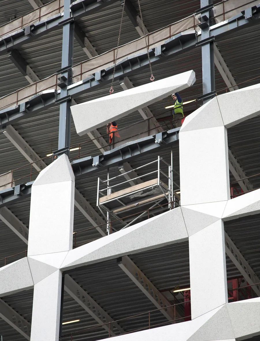 具體的施工流程為:測量、放線→GRC板塊加工圖排版加工→鋼龍骨製作安裝→龍骨驗收→安裝GRC板塊→表面飾面處理