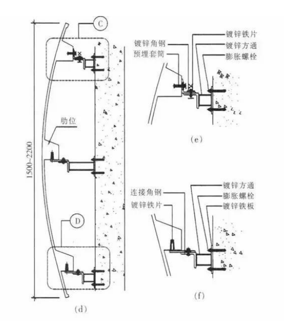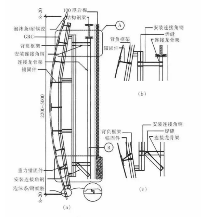 CRC帷幕牆曲面板與建築主體連接構造示意
