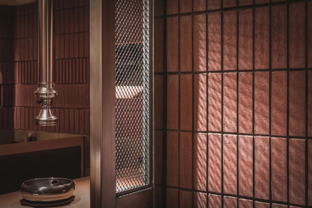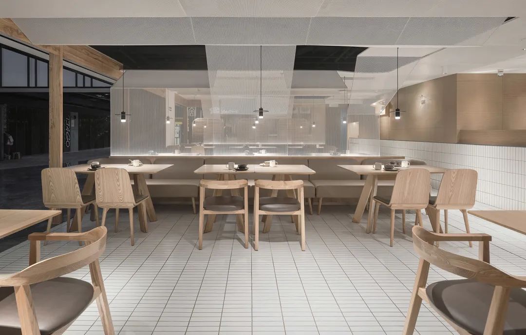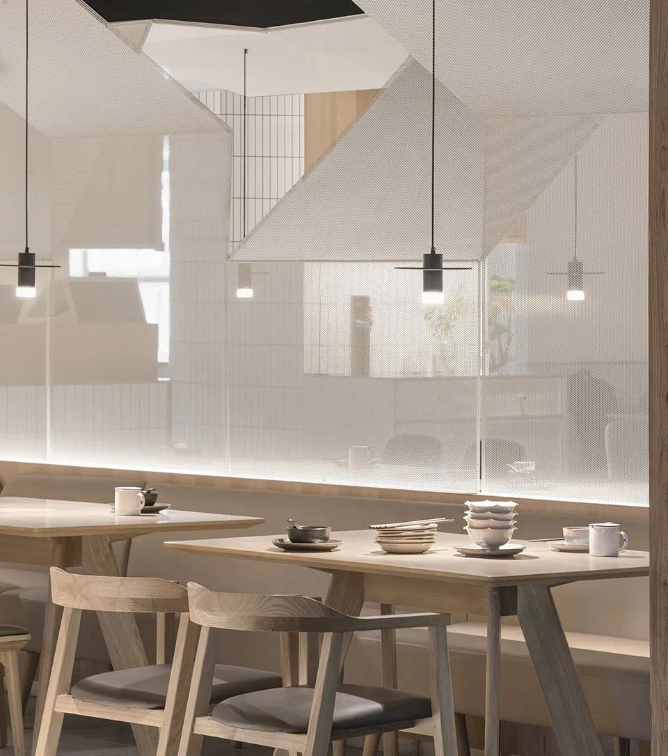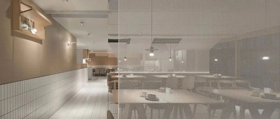 餐廳室內,白色金屬網保留了空間的通透性