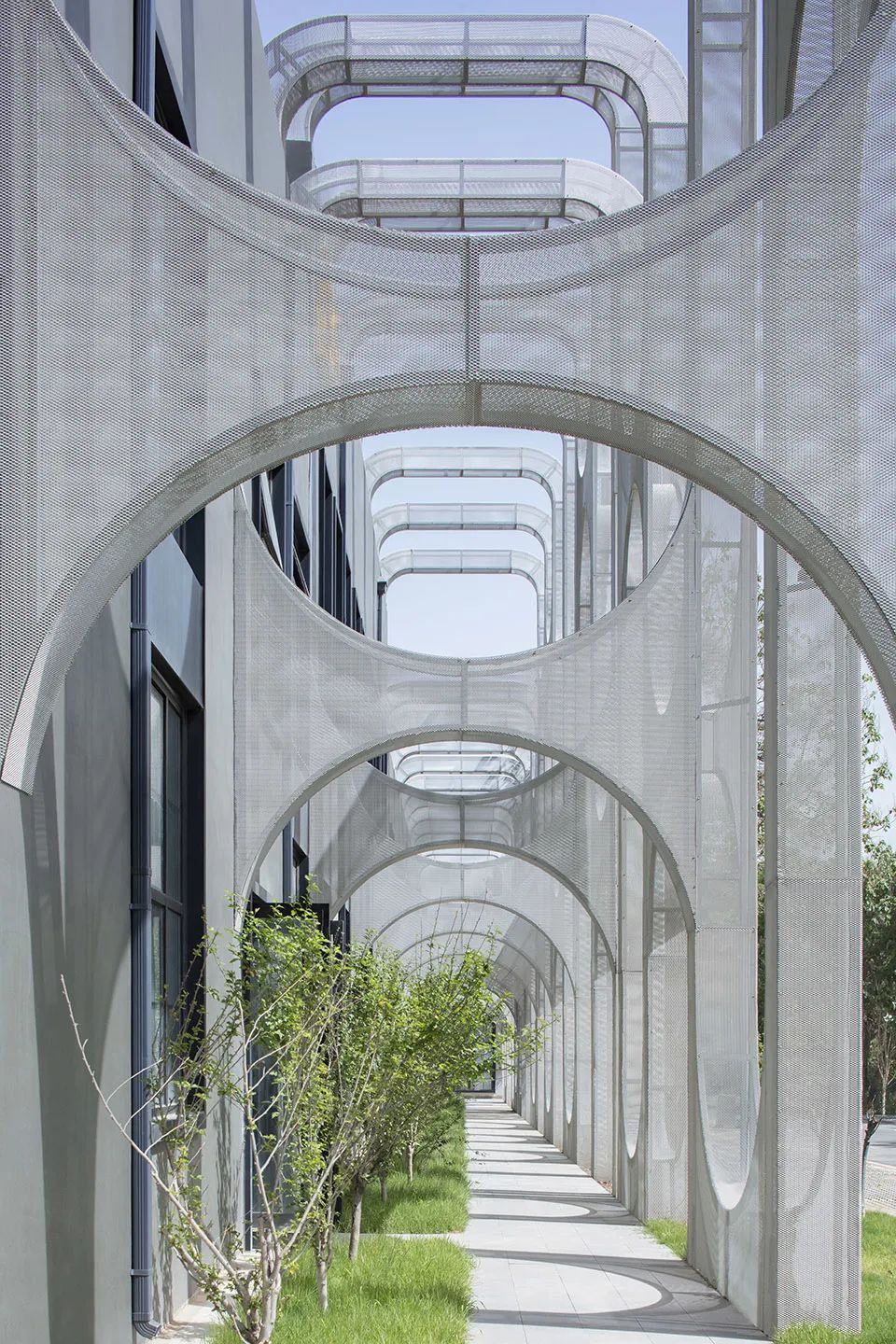 金屬擴張網可以很好的詮釋闡述建築本身的結構韻律,同時柔化了整個空間質感,常用於工廠改造或舊建築改造,光線透過擴張網這層「皮層」照射進來,為建築增添朦朧美感。