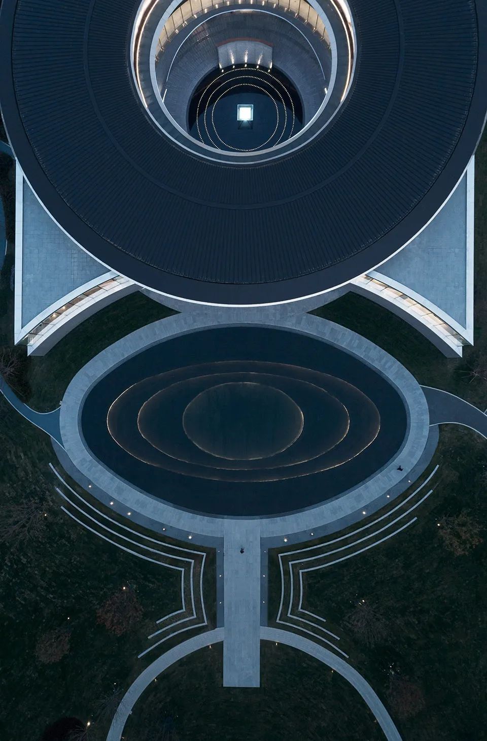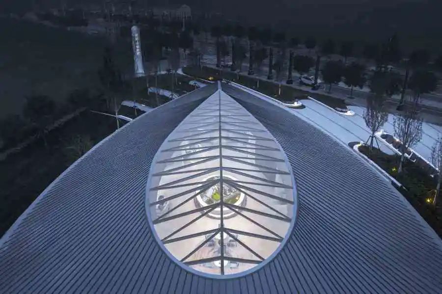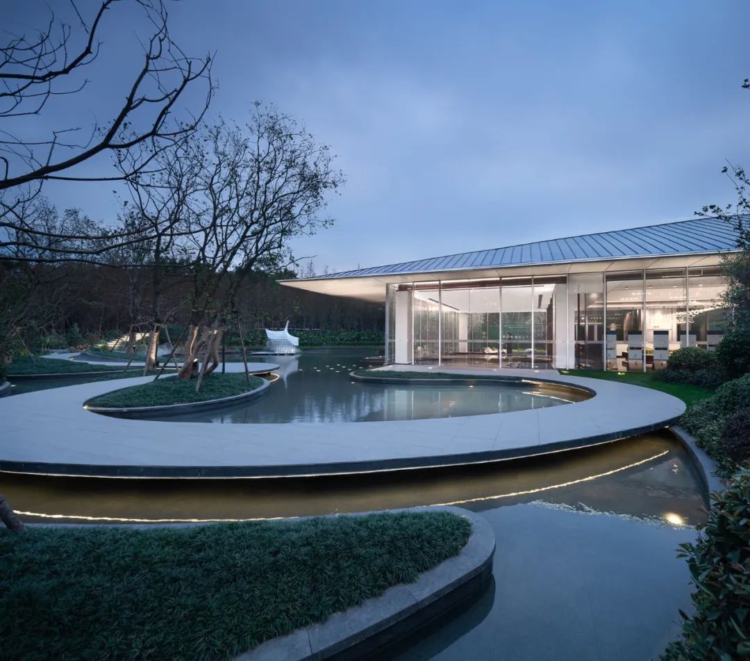 展示中心如同一顆晶瑩剔透的水滴,煙灰色的鋁鎂錳瓦屋頂,超白的鋼化玻璃,使建築的漂浮感進一步增強。