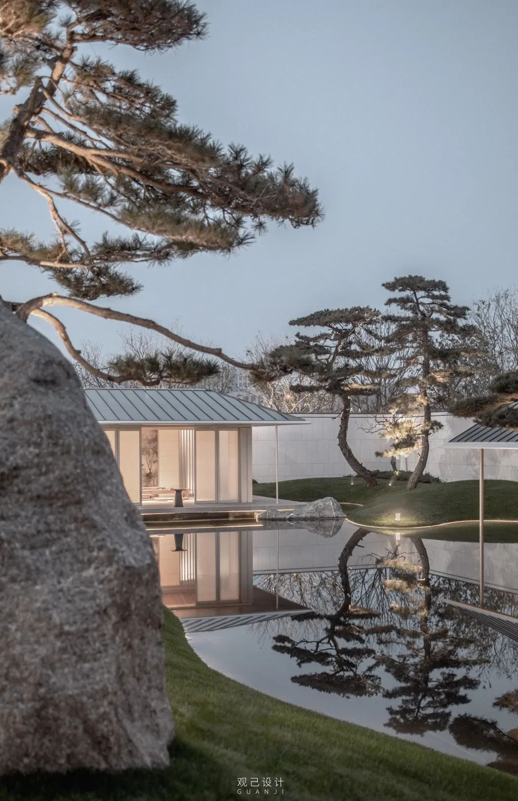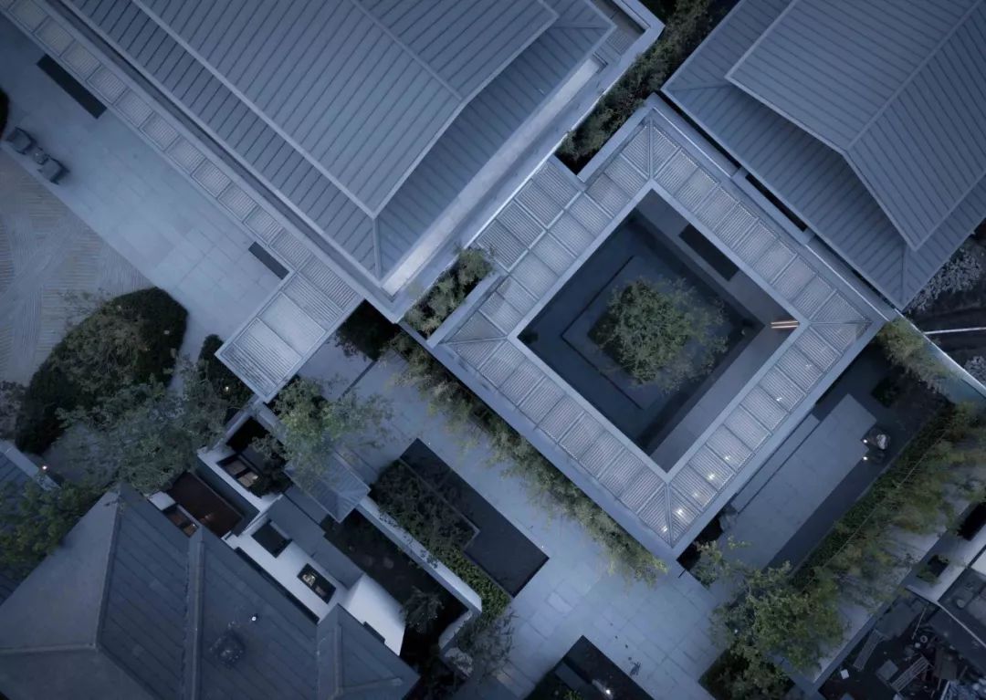 雲山庭順勢而折的金屬斜屋頂不僅契合整個基地,而且讓遠山與近水建立了聯繫,正如蘇舜欽筆下對蘇州滄浪亭所描繪的那樣:清風明月本無價,近水遠山都是情。