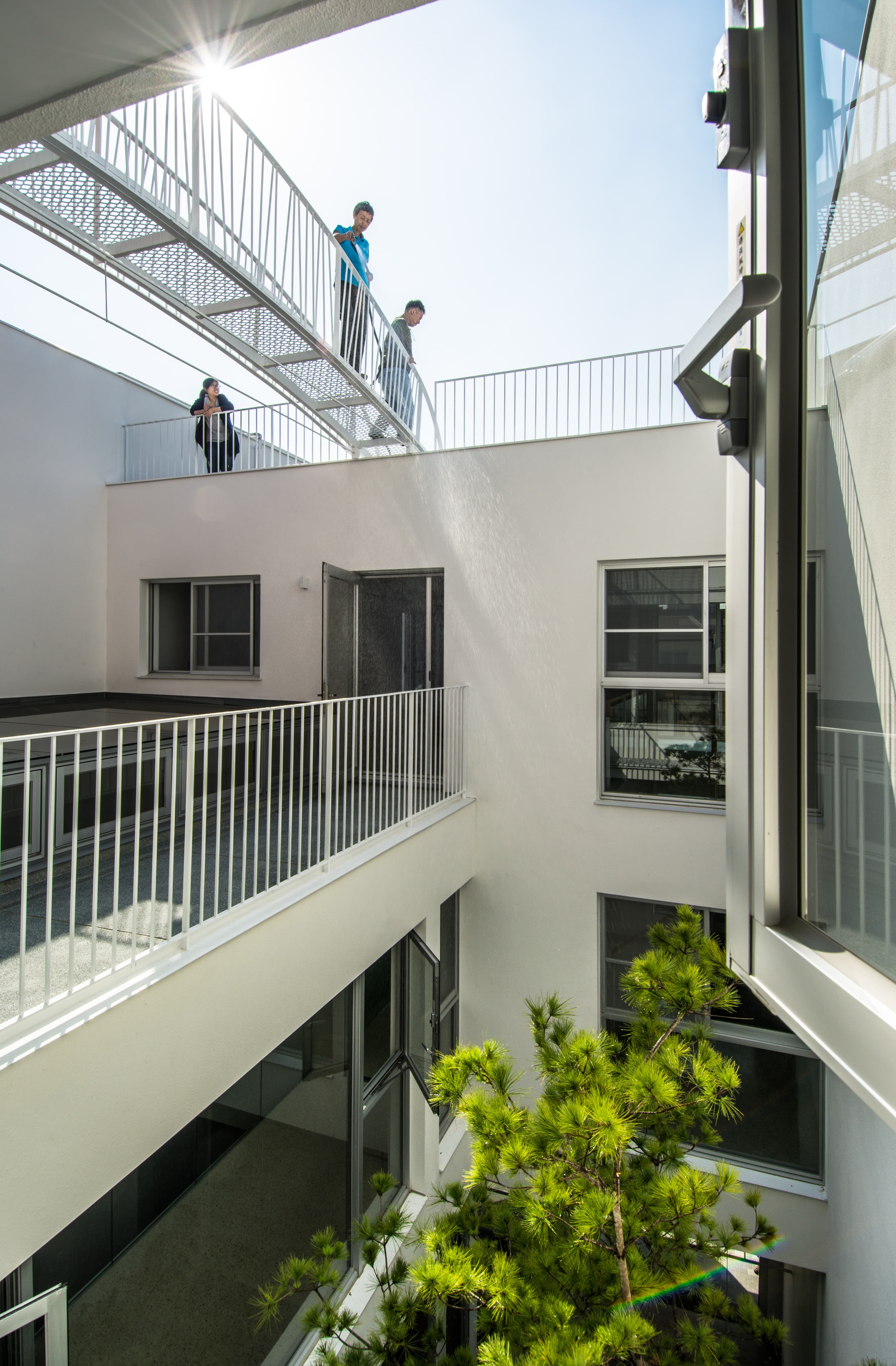 屋上的兩層則是家人們重回城居聚會的場所,假日時離開柴米油鹽的家,來到另一個風光雲影的小屋。極小的居室空間以或廊串接錯落的屋頂露台,山谷上的風景輕鬆閒散,既能獨處也能交心、既在城中又在天外,自成一方閱讀清談的寧靜之地。光與綠正是這居所的主題,呼應著能量醫學的自癒精神,在狹形街屋裡創造自己的谷地與天際。