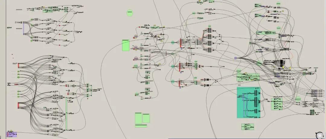 建築師將其間複雜的邏輯關係在Grasshopper中藉由六千餘個電池及上百個可調參數建立起來,在電腦程式中完成了主控網格的搭建。在緊迫的設計週期中,主控網格系統的有效率性即得到充分展現,任何基準曲面的局部調整、構造距離的變化,都能在全局得到迅速響應,實時更新輸出數據。