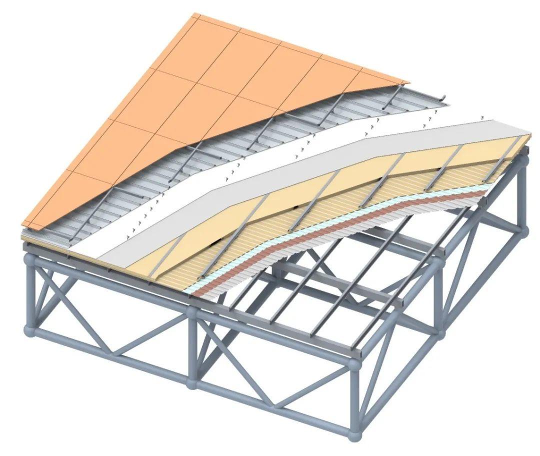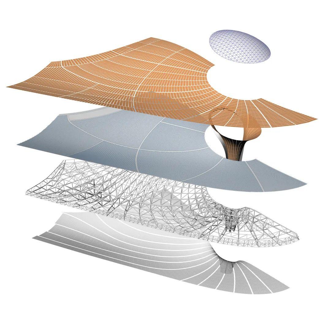 建築師外殼屋面系統設為5層基準面,從外到內依次為:1號屋面裝飾板完成面基準面、2號屋面防水層基準面、3號主鋼結構上弦球節點中心點基準面、4號主鋼結構下弦球節點中心點基準面、5號吊頂完成面基準面。設計團隊藉由T-Spline曲面定義1號和5號基準面,由1號曲面向內偏移得到2號、3號曲面,由5號曲面向內偏移得到4號曲面,不同部位的偏移距離受屋面、吊頂構造做法預留高度的控制。3號面與4號面的z軸間距,即主鋼結構上下弦間的結構高度受大跨度空間結構的需求而連續變化。