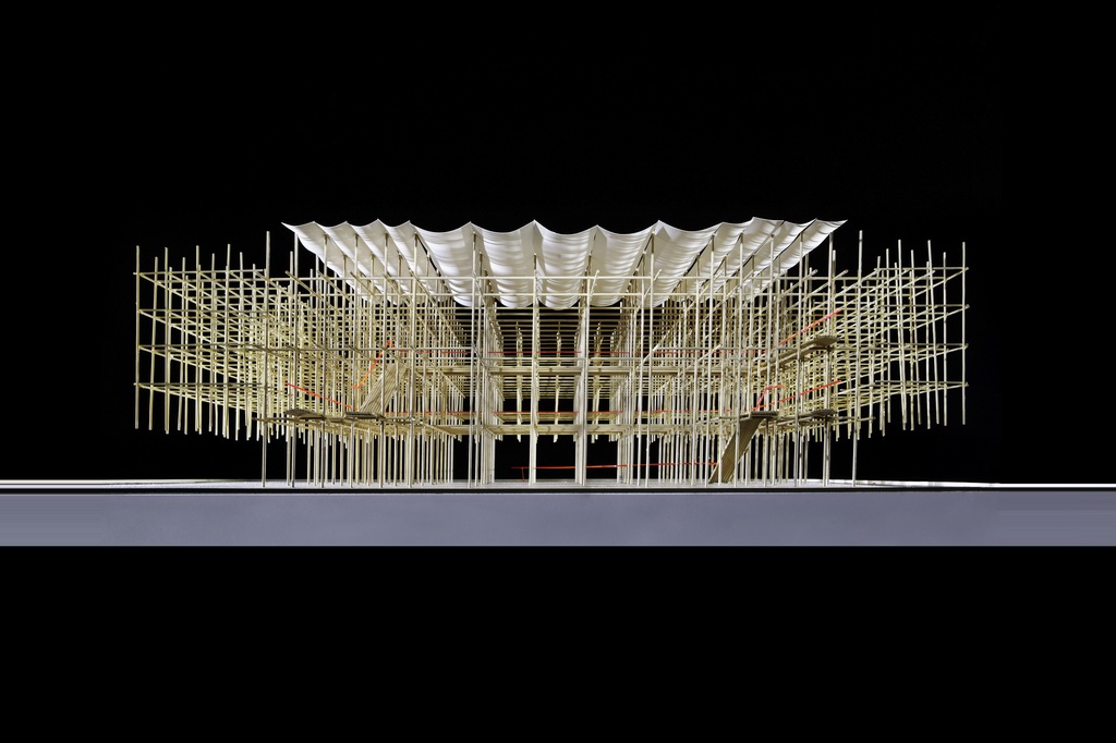 X-Site裝置的主要元素有三:竹鷹架、帆布、線型金屬扶手