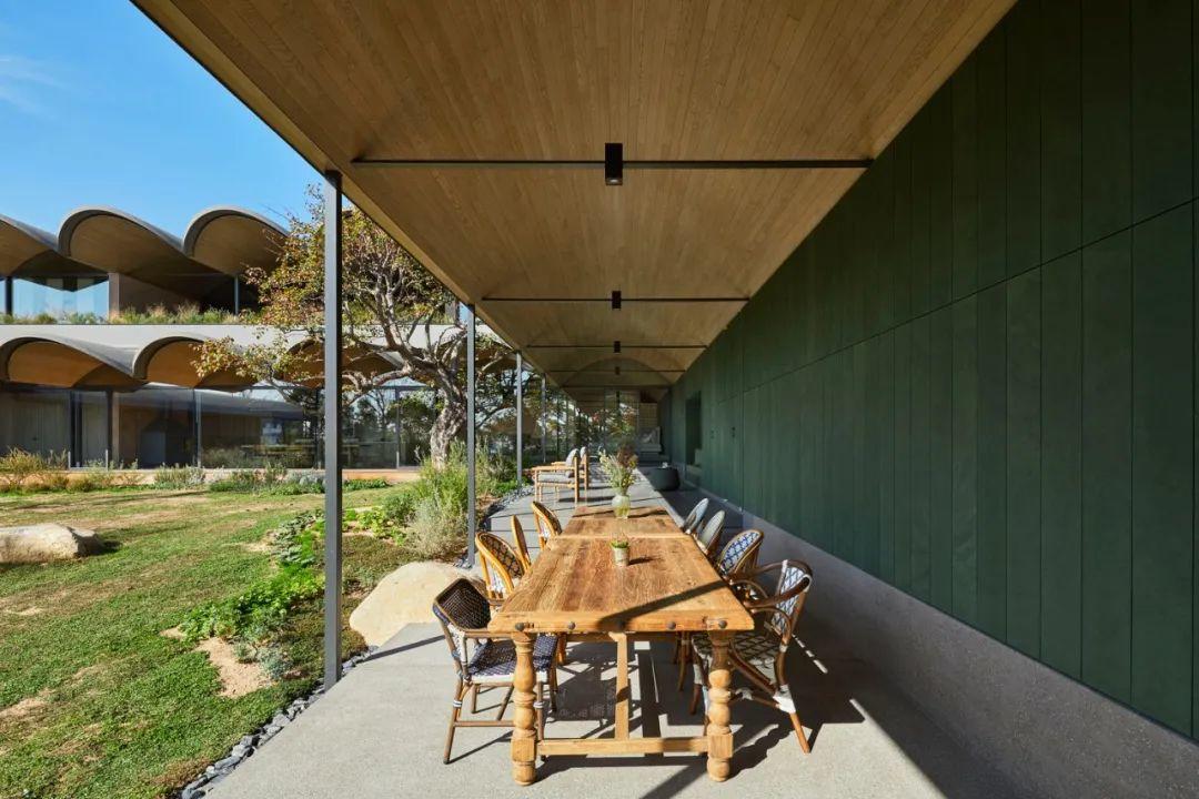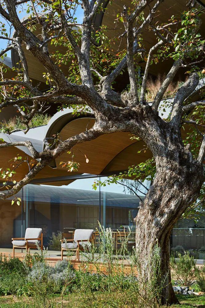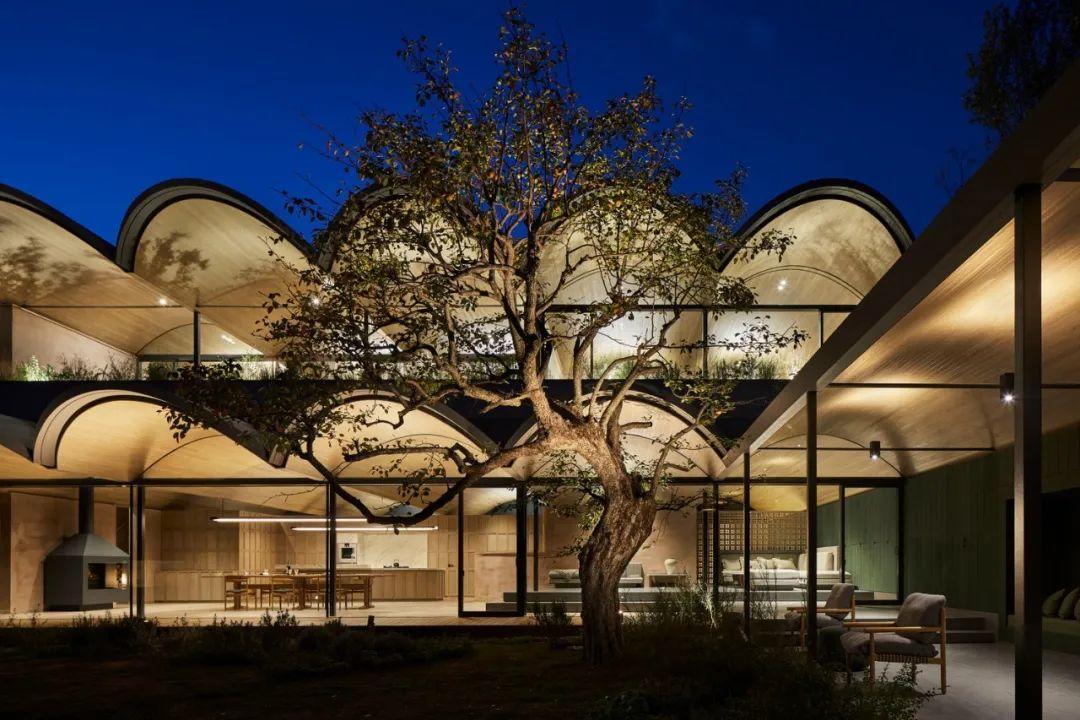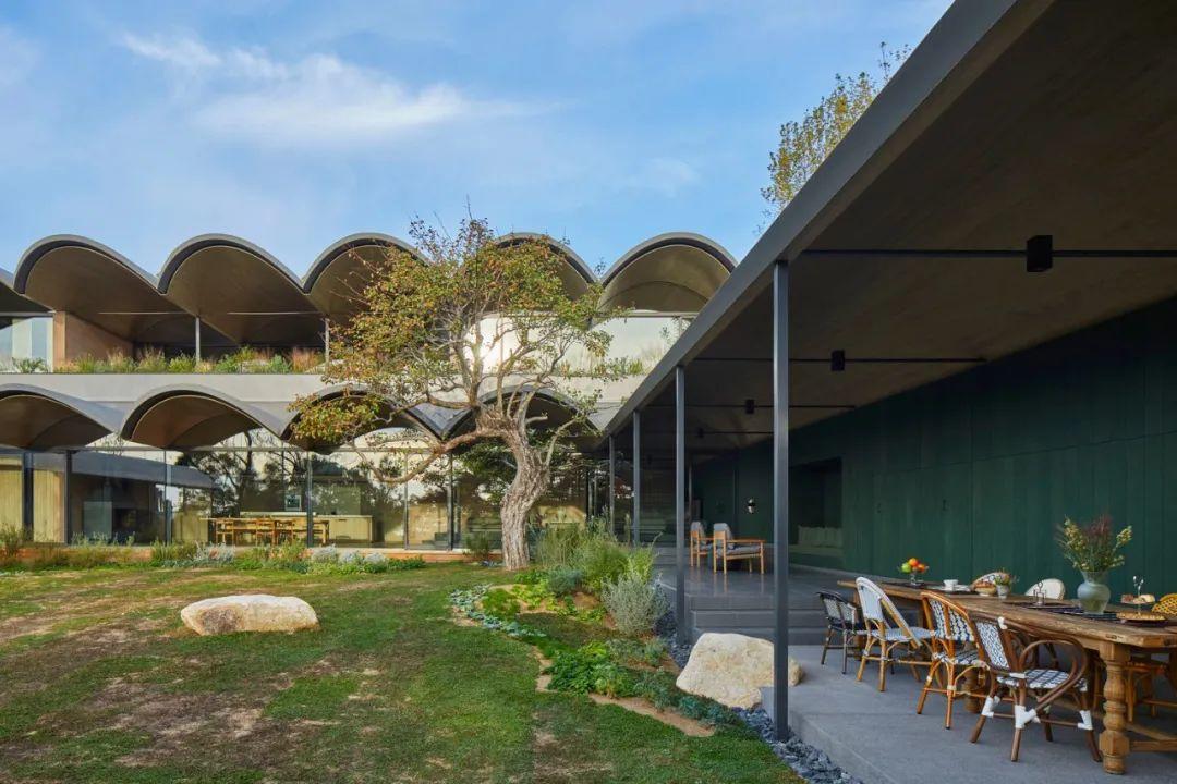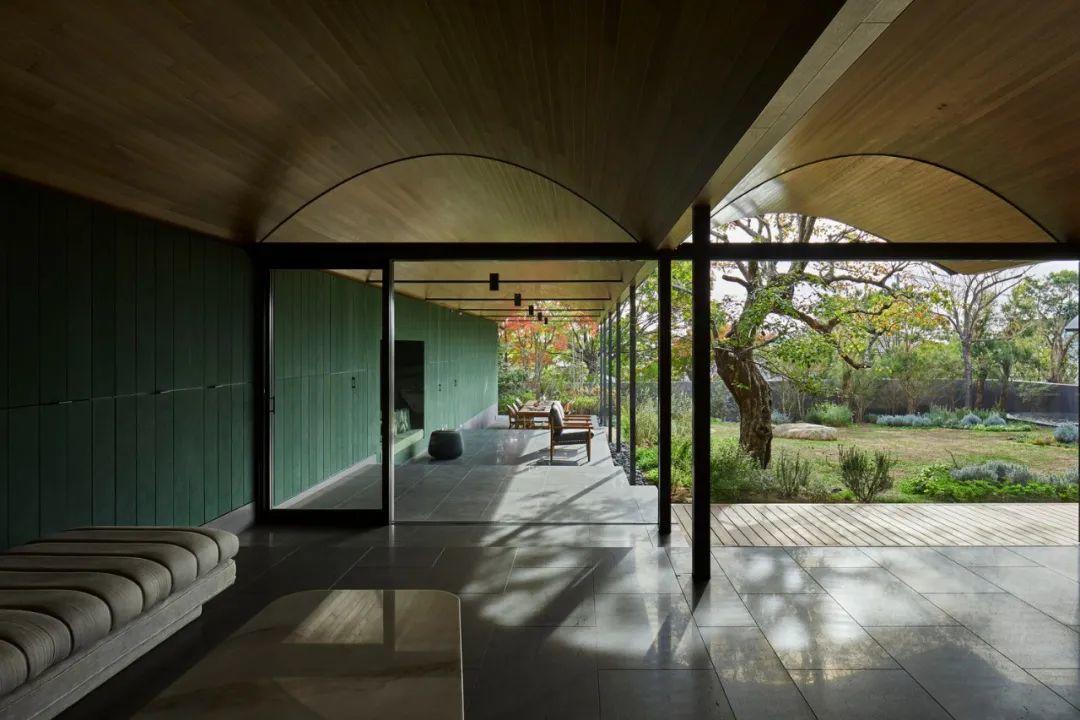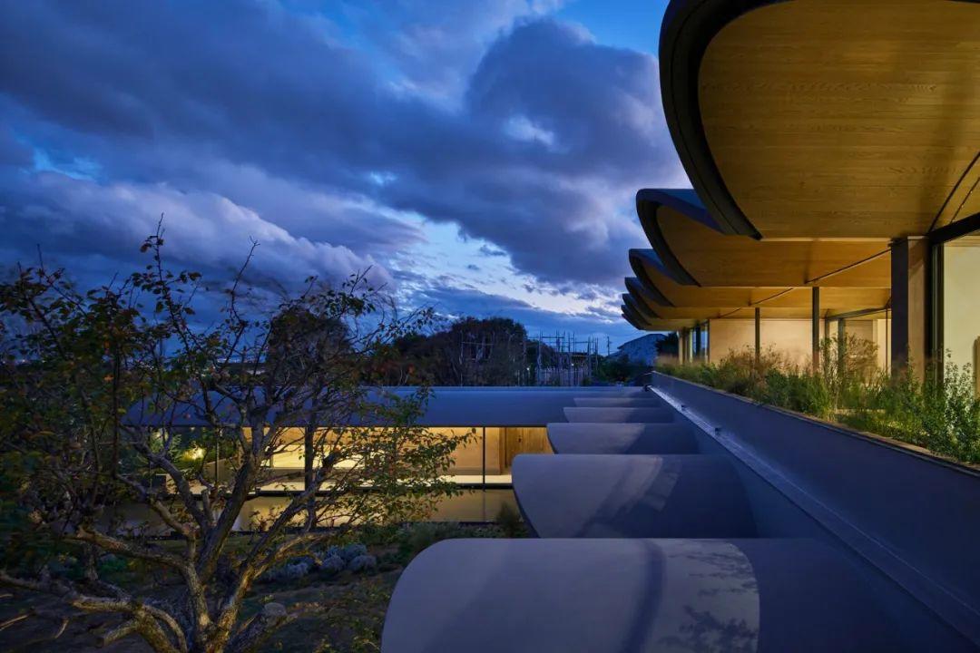 拱頂讓人意識到庭院的存在。其形式可以讓厚120毫米,長3.1米的懸臂板伸入庭院。不僅能創造出一個大型的半室外空間,還能夠像望遠鏡一樣框出桶形拱頂之外的美麗景觀,將露台的近景、庭院的中景以及城市和海洋的遠景聯繫起來。