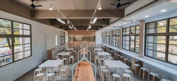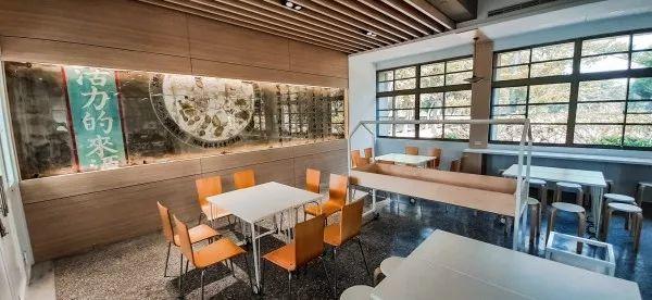 山川設計將空間及傢俱解構重組,利用輕便特製的傢俱,以符合空間機能性;此外,保留施工初期意外發現的復古牆面,配上具工藝感的吊燈,營造出獨特風格。整體空間乾淨明亮,桌椅可以有各種不同的排列組合,還有輪子可以移動、收納,需要時能化身寬敞無阻隔的大空間。