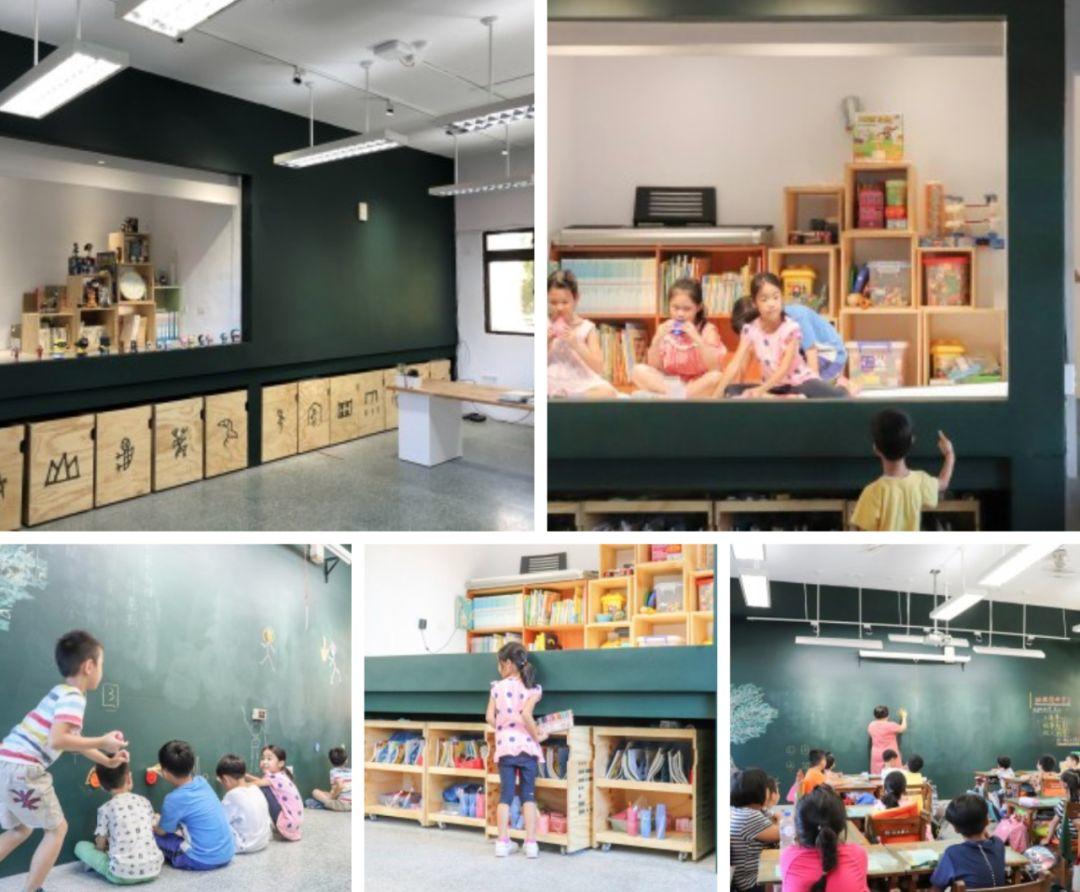 洪浩鈞帶領的共序工事設計團隊認為,這個有別於一般教室型態的小隔間,在空間的切割中加入了室內窗,讓通透感得以延續,可以提供教室更多的可能及樣貌,所以將空間改造成舞台,並結合教室前、後設置的全黑板牆及移動櫃體,打造出可因應課程內容進行多元變化的未來教室。