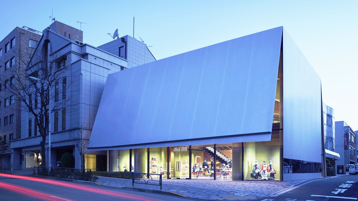 為 Miu Miu 設計的青山店位於知名的 Prada 東京旗艦店的斜對街,Prada 東京旗艦店也由Herzog & de Meuron 建築師事務所設計,座落在二十多年來作為新興建築展台的一個雅緻街區內。與 Prada 全玻璃的透明感截然不同,Miu Miu 立面樸素的金屬表面是不透明的,這也打造了更私人的空間特性。