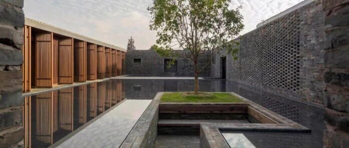 平直的天際線中跳脫出三座建築:一座兩層高的客房,一座包含四間客房的湖濱小築,以及位於行館一端的一座多機能建築。多機能建築由原有的廢棄倉庫改建而成,包含了新建的混凝土結構,其中有一間餐廳,一個劇院和一個展覽空間。如恩希望採取利用這件作品最有特點的兩個景觀元素—— 牆與院——將一個複雜的基地格局統一起來,採取粗獷的材料和層疊的空間營造,用現代的設計語言重新定義傳統的建築形式。