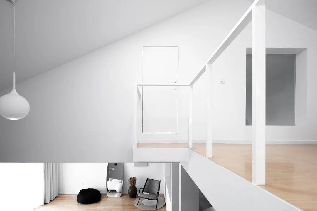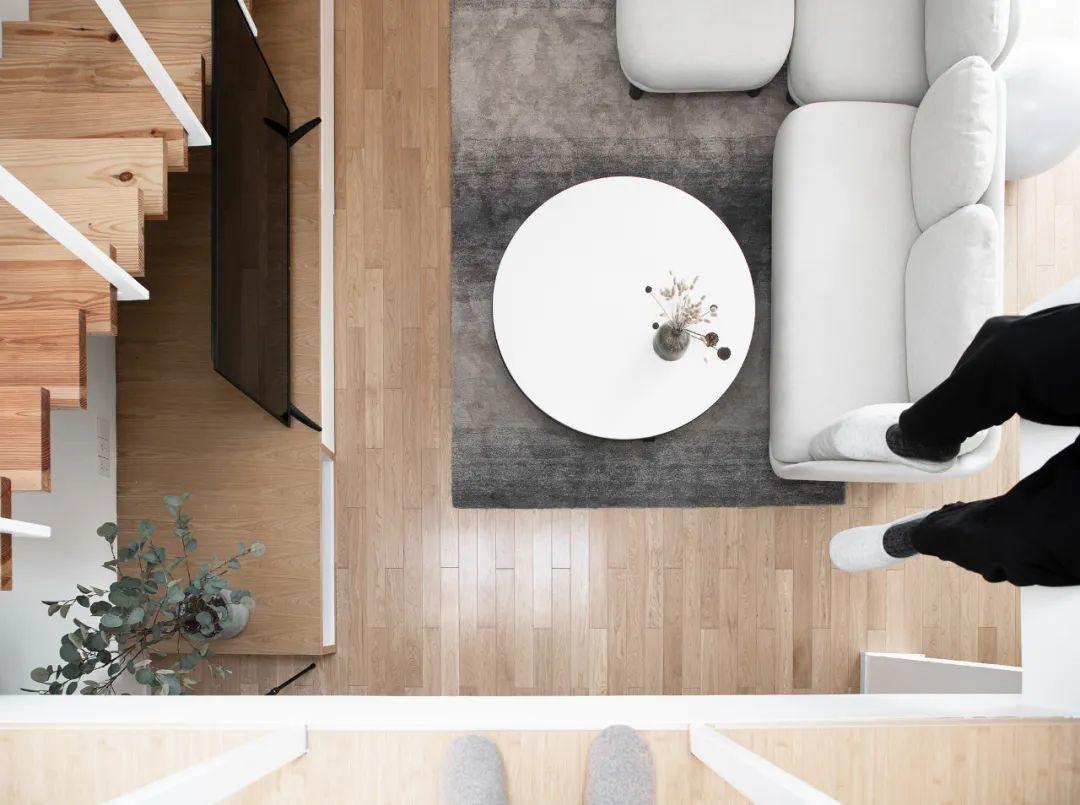 閣樓俯瞰,以原木配色為底的白色空間內,精量化的材質搭配,使得空間更加純粹且有溫度。