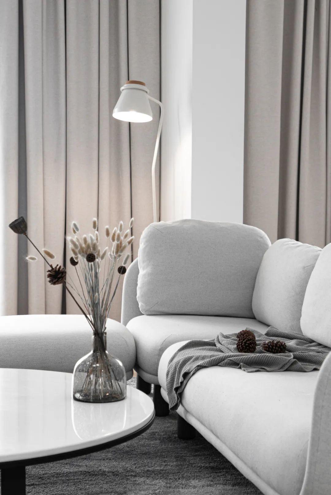 精簡非必要的第三方傢俱。主體軟裝遵從空間屬性,以灰色調的簡約傢俱搭配。