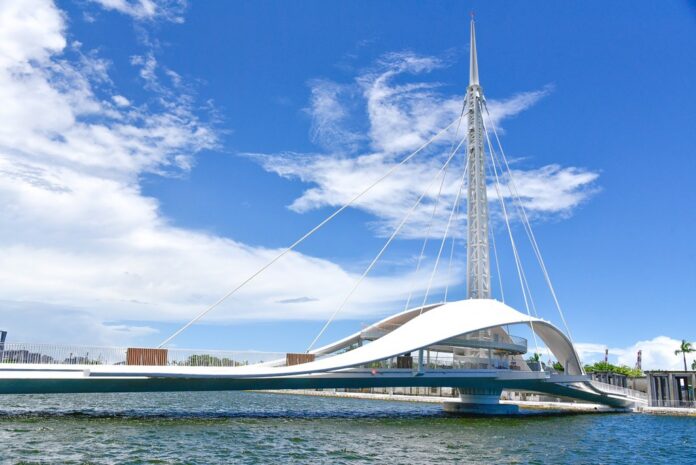 走在駁二藝術特區的碼頭旁,可以看到水面矗立一座白色又兼具設計感的橋樑