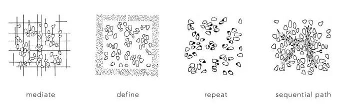 槇文彥將介於城市和建築之間的領域被稱之為“中間領域”,這個概念來源於日語中的「奧」和「間」,意為與空間概念相關的“內在深度”,也是日本建築和城市構造的特點,即在一個空間中建立一個吸引視線的焦點或無形的中心。
