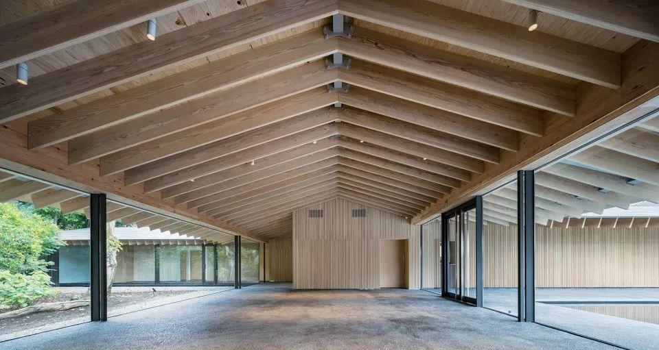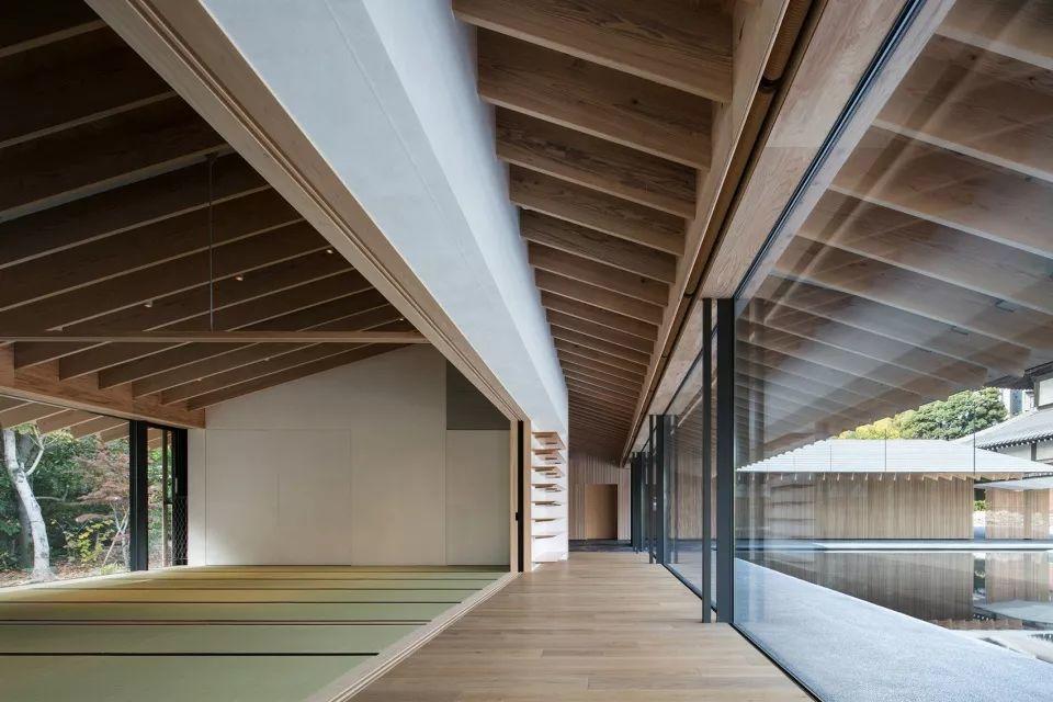 建築由隈研吾代表性的木構造搭配現代鋼材的組合作為支撐,外部的木質托梁和格柵窗相互呼應,不僅符合了中國寺廟強調深度和對稱的配置特點,還符合著黃檗宗的幾何學美學。