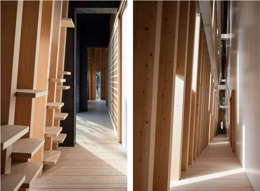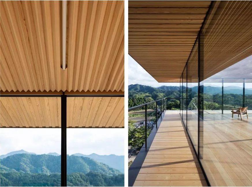 建築師在鋼結構的建築腰部增加了550根檜木,同時加入了88塊玻璃隨機擺放在交錯的木椽間,兼具加固的機能,來適應多風多雨的山中氣候。