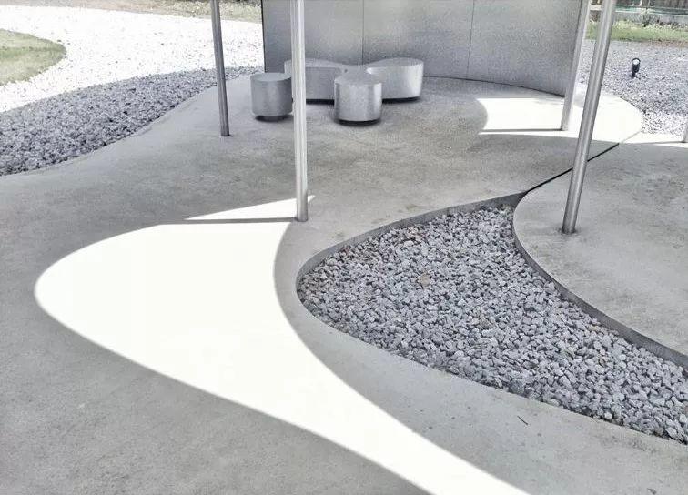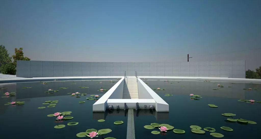 從海邊走到丘陵的最高處,橫亙在人們眼前的是三公尺高的清水混凝土牆。它和相鄰的等高弧牆形成了有方向的路徑,走到路徑的盡頭,則是一個橢圓形的蓮花池,象徵著佛教的「步步生蓮」。