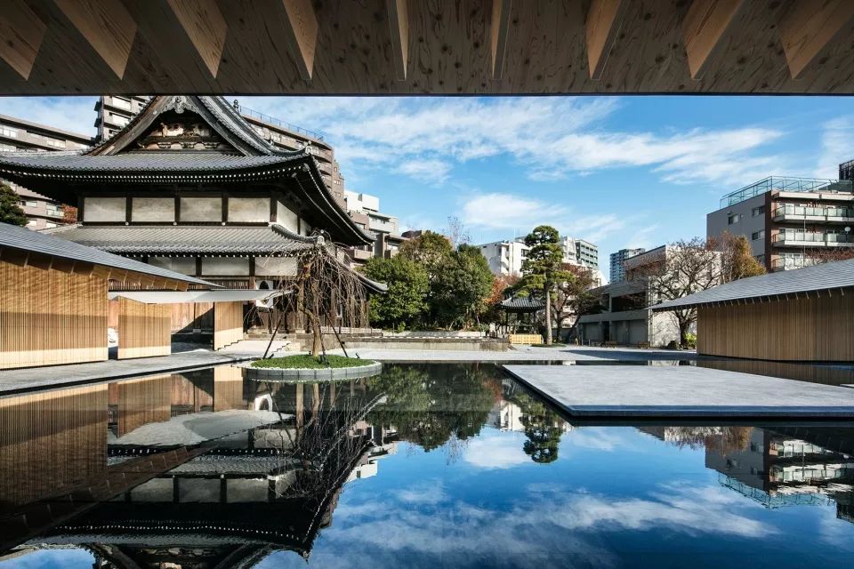 這座寺廟位於東京白金台車站,是禪宗分支 Obaku Sect在東京的第一座寺廟。寺廟請來了建築師隈研吾,來重建寺廟內僧人的住所。建築師保留了原本從寺廟儲存庫延伸出來的軸線,在軸線的南側設計了一個U形的迴廊和禪院。庭院的中央是一個水池,在水池中有一個舞台,方便了人們在這裡舉辦寺廟活動。