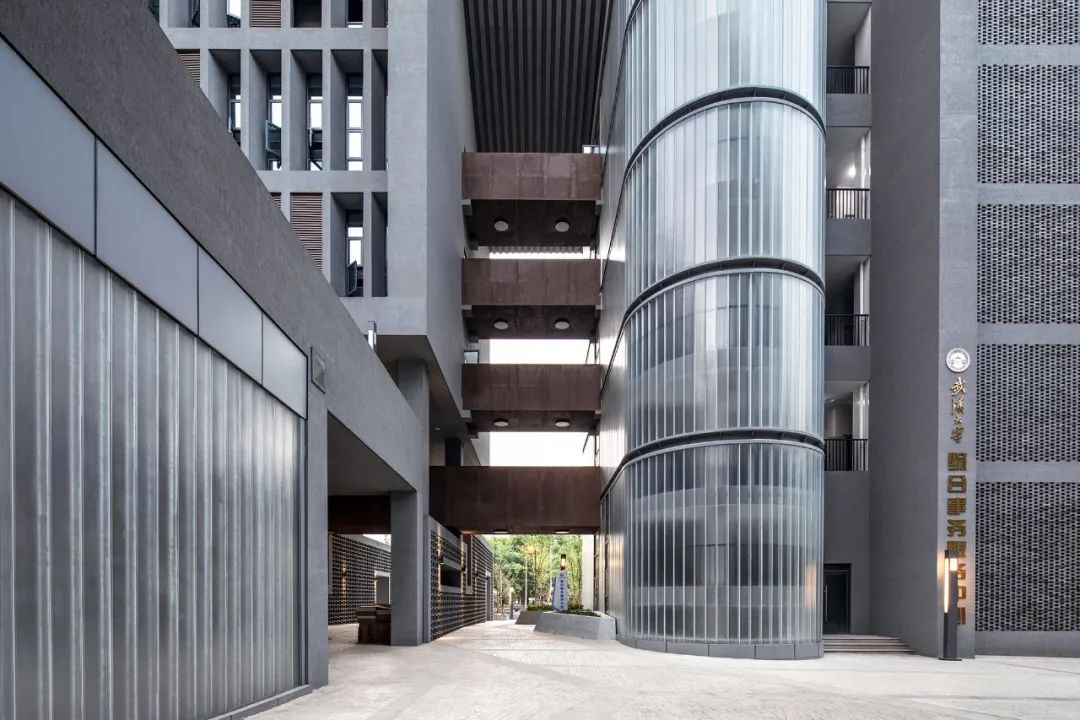 基座部分則半隱半顯,更多的設置在內庭院部分,連通室外廣場和內部庭院,結合特色的樓梯、台階和坡道,在不影響建築整體比例的前提下,延續武漢大學“高台”的整體脈絡。全新演繹的綠瓦、青磚及高台相輔相成,共同構築起一座傳承武漢大學百年神韻的現代建築。