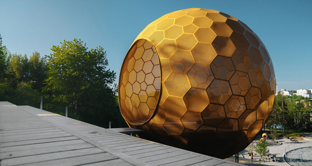 這些木製的圓球由CNC切割的冷杉木條加工而成,內外都採用了亞麻籽油塗料處理,在幫助形成顏色的同時,還能在冬天發揮抵禦嚴寒的作用。