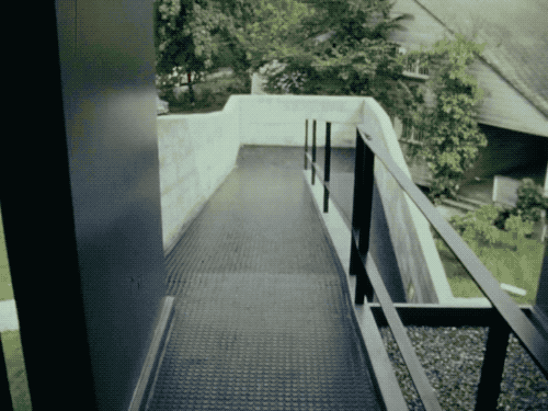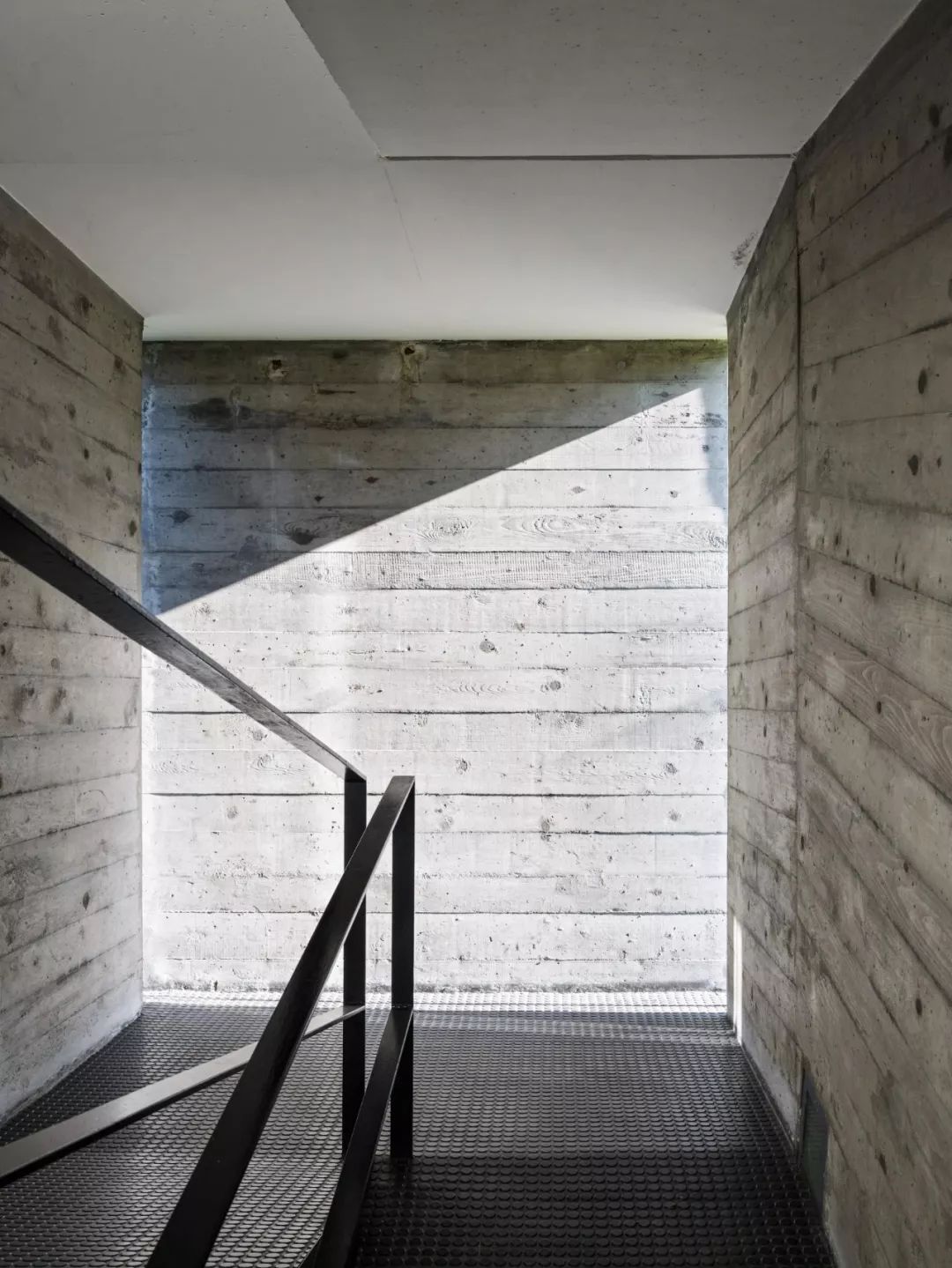 柯布西耶標誌性的混凝土自然不會缺席,成為了樓梯的主要材料。粗糙的混凝土和黑色的鐵製細扶手,整個空間的層次感和裸露結構也宣誓了標誌性的美感 ▼