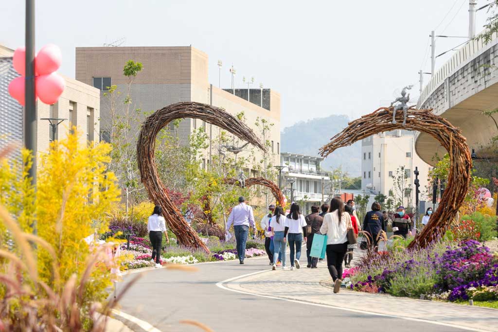 建設局長陳大田說明,「花之道」有別以喬灌木複層及草皮為主的公園景觀設計,採自然庭園概念形塑戶外花園,打破傳統整片花海方式,豐原示範點以「小而美」區塊植栽呈現,並以錯落方式於園道設置愛心裝置藝術,民眾一進到園道就能看見充滿幸福的意象。