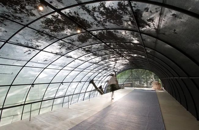 網室空間是模糊灰色化的,適於世隔絕的獨處。暗室內部交融的影像、燈光、聲音等精神之物,皆在模擬自然與建築的交織:原始樹林下的婆掌幽影重重疊疊的深處,蘊藏著神秘未知的氣息,力圖激發體驗者對多重感知的覺察與無限猜想,重返原初和諧的身體意識與精神狀態,令人產生了莫名的敬畏和則隱之心。影像區內的大螢幕如同作為建築之眼的窗戶,承載著連接自然的接口。