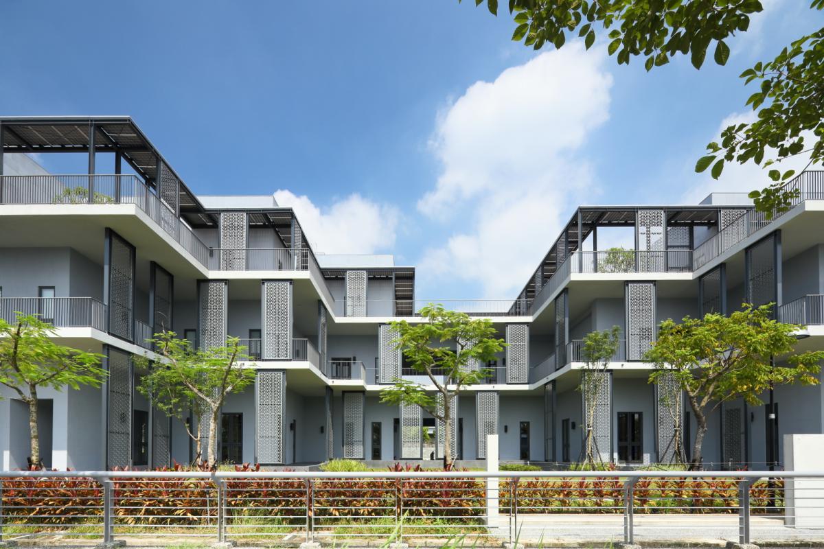 綠建築是本案的設計重點,希望有好的通風採光,並減少用電量,因此西南向立面採用外廊道構造,有效降低直接日照,窗戶亦採可開啟的細長直窗促進通風;東北面配合機房及梯間則用較小的方形開窗,創造韻律感亦減少日照量。為了表現漢餅精神,並提供適當遮陽,石昭永建築師事務所於外廊道採用類似江南庭園的花格窗,在不同角度陽光的照射下,產生不同的陰影圖案,創造持續變化的建築物立面,走在外廊道中,可感覺到花格窗的陰影投射在地坪及牆面上,使原本表情平淡的廊道突然充滿詩意,並且與庭園植栽產生緊密的連結感。