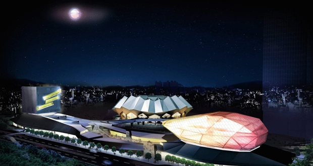 主廳館是由3,000席室內表演廳及流行音樂業界專用的辦公大樓共組而成。這樣的安排,如同一處流行音樂產業的育成中心,讓製作人、藝人及行銷業者每天共處同一個屋簷下,直接溝通、互動。
