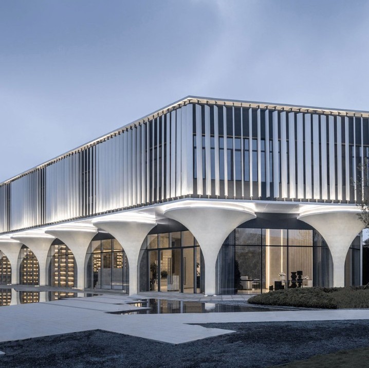 建築的二樓立面採用18塊金屬梭形格柵,如律動的琴鍵鑲嵌在8400的開間中,每塊格柵旋轉10度,按450間距定距安裝。充分兼顧實際機能與視線的通透性,開窗的位置,格柵與牆面垂直;柱子的位置,格柵與牆面平行,自遠而看,漸變旋轉的格柵如同輕浮的羽衣,隨風而動,如影而行。