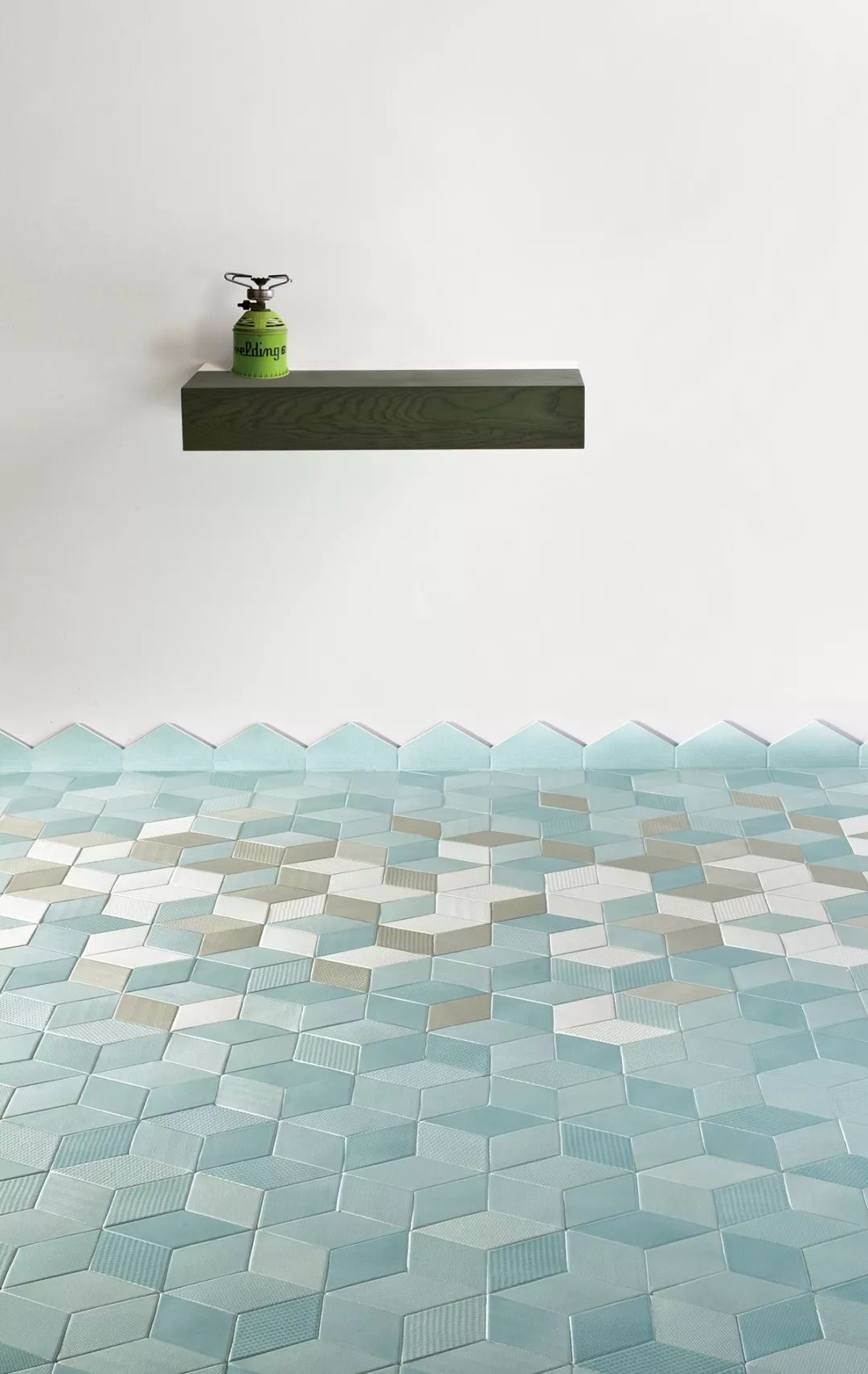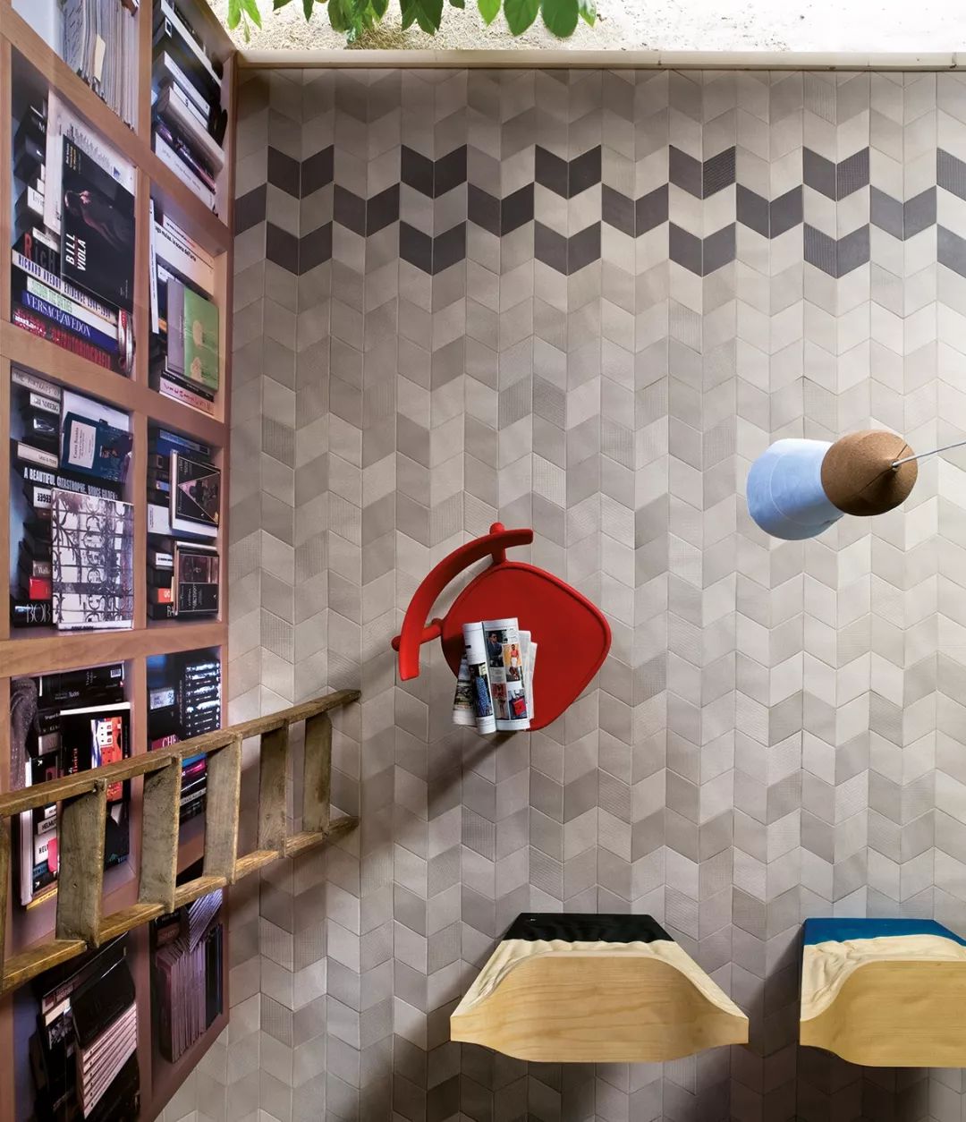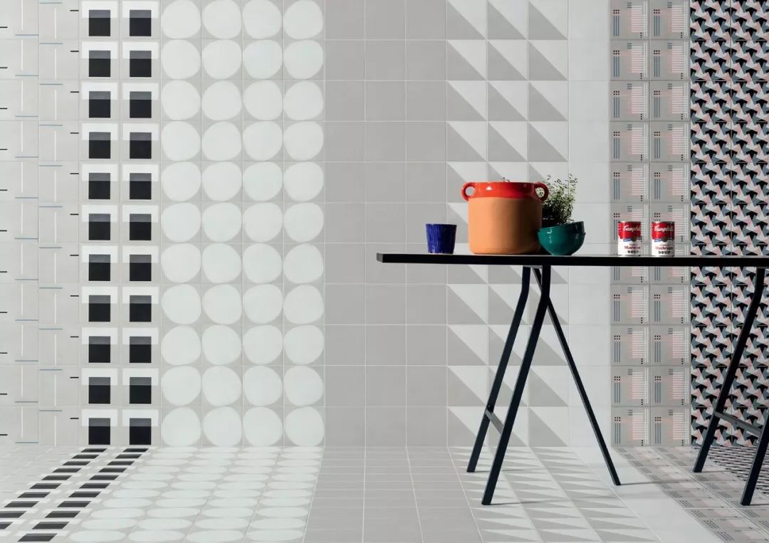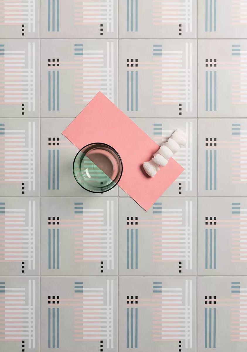 這種創新的釉面磚系列,採用白,灰,藍,綠色和紅色調的方形、三角形和鑽石剖面元素,由瓷磚、馬賽克和 3D 元素組成。