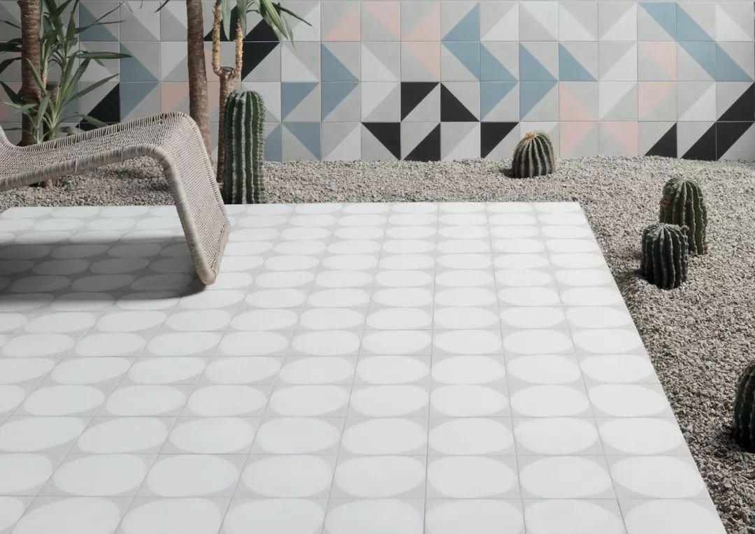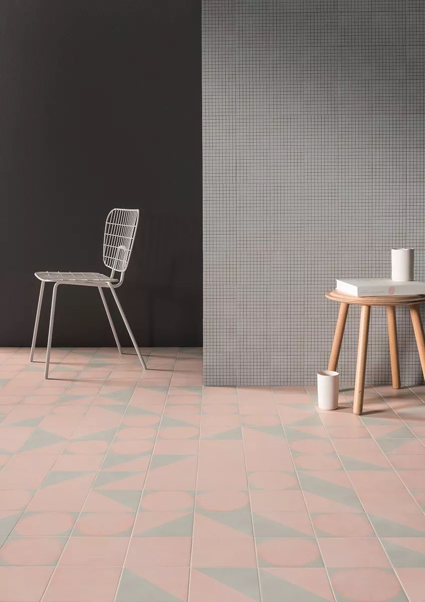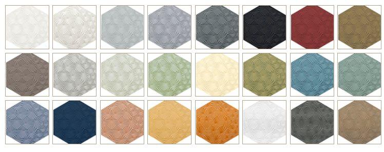 這款現代釉面硬瓷磚表面是消光混凝土,包括五種純色和八種圖形圖案,是相對柔和的彩色色調。