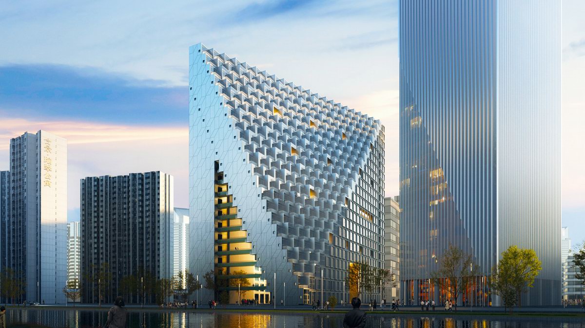 未來新湖中心如同指向雲端的一座山峰,以建築表達形式呼應了「上有天堂,下有蘇杭」這句古語。而相鄰是一座總面積為35000平方米的住宅塔樓,其外立面設計與杭州光棱的幾何線條相呼應,兩座建築相輔相成。