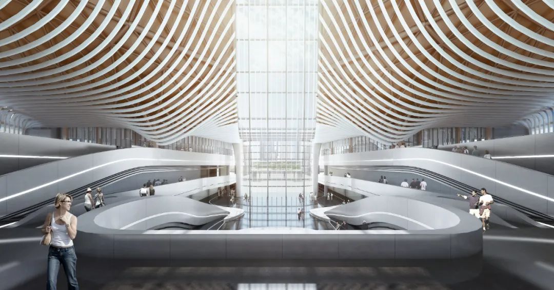 藉由具有導向型的空間塑造,將形體語匯內化為衢州雙中心內部連續流動的空間。設計重點是將相對獨立的文化藝術中心和公共服務中心藉由中央圓形中庭有機鏈接。各主要機能區塊人流由外圍四向進入,匯聚中央形成活力中庭。藉由若干公共豎向交通有效組織地下、地面、空中交通,並由兩處空中連廊順勢導入演藝中心、文化中心兩大機能組團。