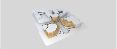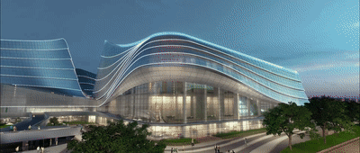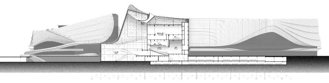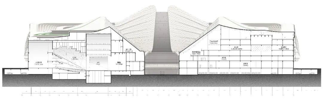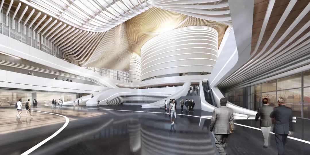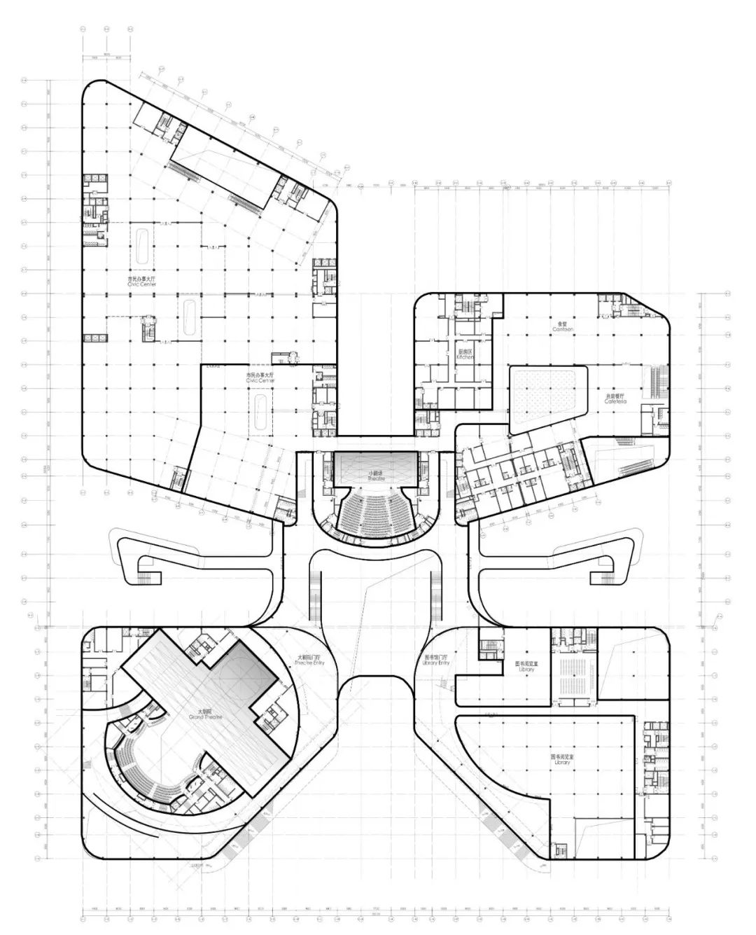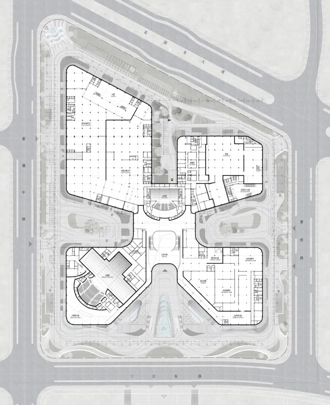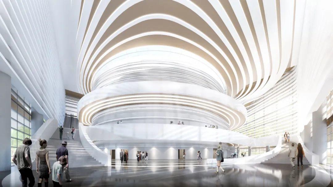 彌漫的氣場在水平和垂直的方向上交織,至高處凝集到足夠的勢能順垂直四向而散,順勢劃分出大劇院、文化中心、會議交流中心和市民中心。各中心之間的虛空,自然地將城市各方向人流順勢導入。流動的建築激發城市空間的場所魅力,將多元的市民文化活動匯集於此。