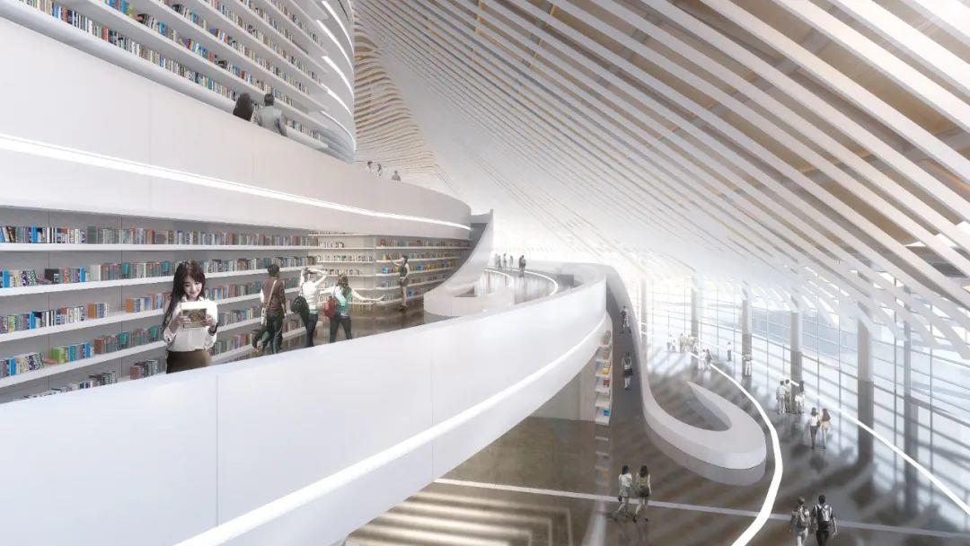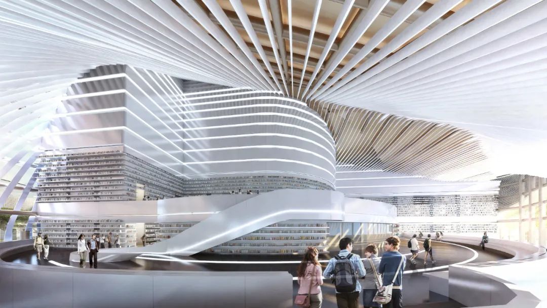 流動匯聚的路徑轉譯成建築的制式語言。既是公共空間的連動,也是人流動線貫穿的內在規律。行至內部,層層內退的共享動線型公共空間、匯集於中心大堂,流向圖書閱覽大廳和劇院門廳。
