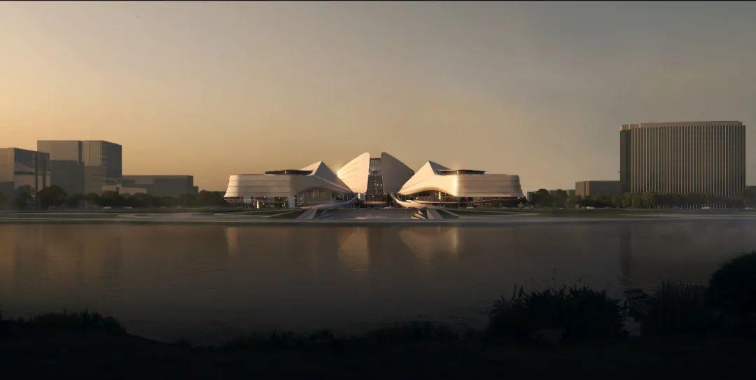 行至外部,可拾階而上直達兩處文化中心頂部,觀景聚會遠眺,形成第二文化中心的城市客廳。內外聯動,始終秉承最原始的概念與語言。內外景緻互借,無論觀展觀劇、閱覽休閒的動靜之間,江景完整融入室內,使建築在形態和機能上擁有獨具一格的借景融景。