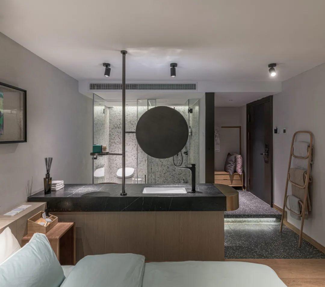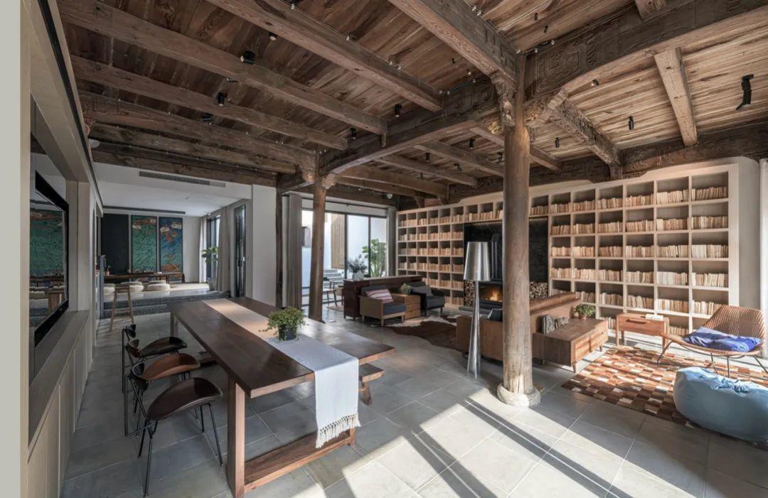 在一層空間裡,設計師配備了前院、客餐廳、休閒區、吧檯區、廚房、後院等功能區域。一方面,通過大量公共空間的設計以促進人際互動與交流,並融入現代化設備,滿足現代生活需求;另一方面,在選材上通過新舊材質多元交融對話,打造出反差美學,同時更體現了老屋一代一代延續的過程。