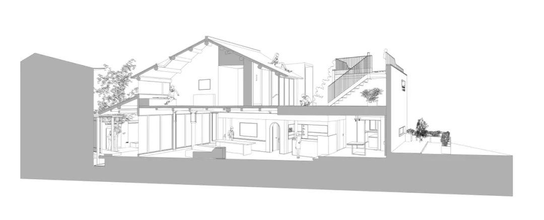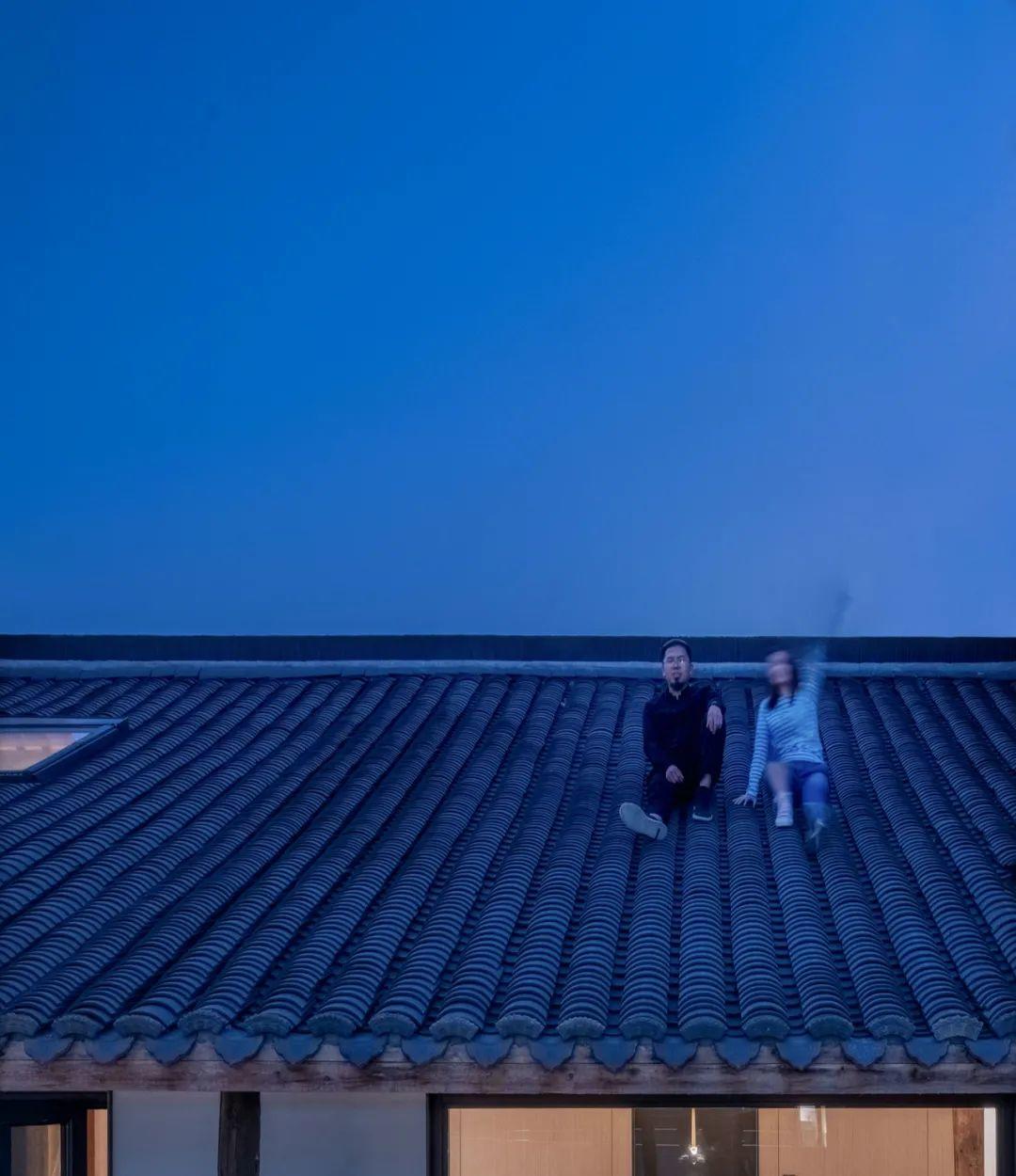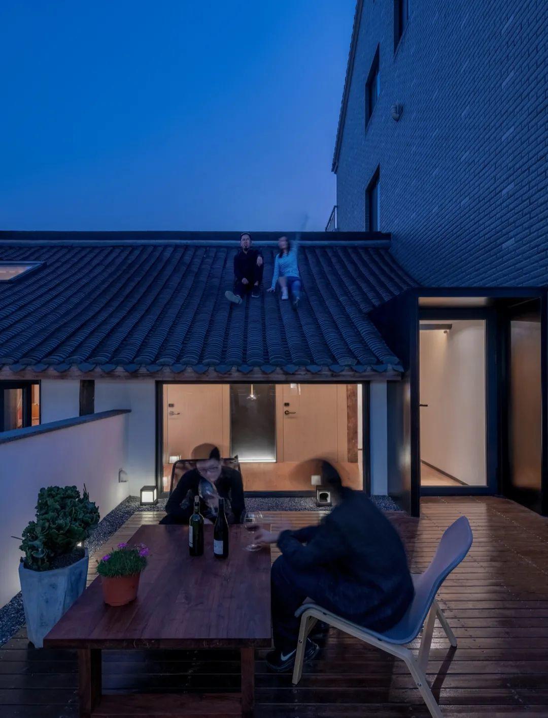 新植入的露台與黑瓦斜屋頂的傳統建築結構相碰撞,以多元視角產生空間對話,讓身處其中的人能夠以多樣化角度感知空間的深層厚度與紋理脈絡。
